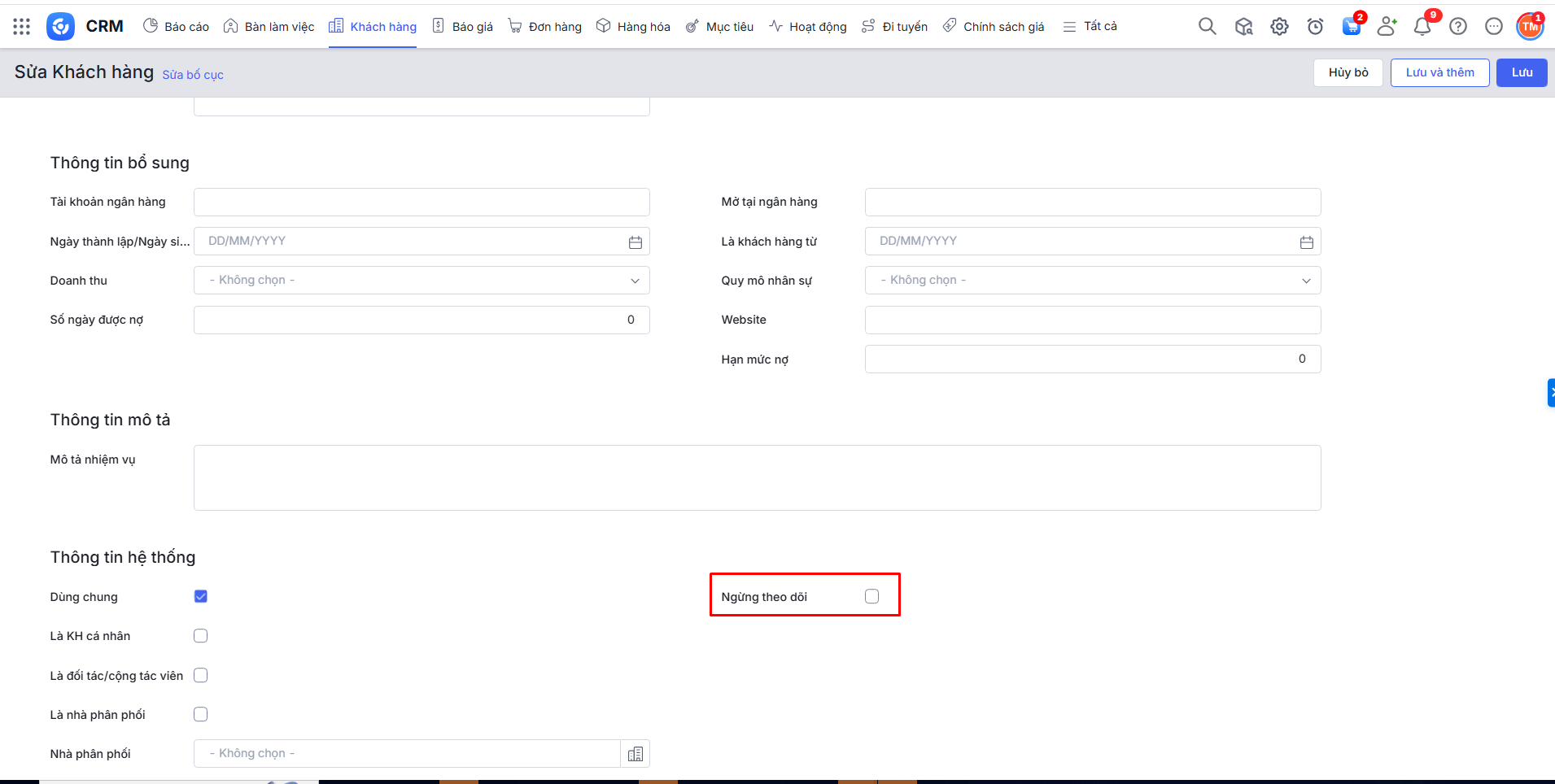 Bước 1: Trên một bản ghi Khách hàng\Nhấn Sửa\Thông tin hệ thống\Tích chọn ở thông tin Ngừng theo dõi.