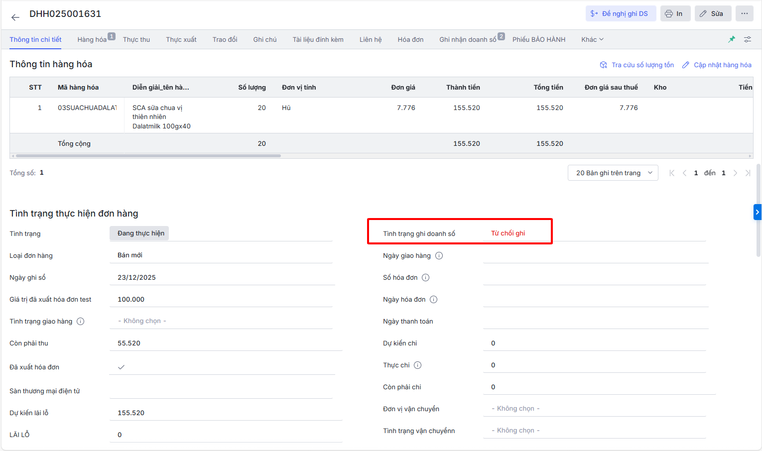 • Khi đó tình trạng đơn hàng bên CRM sẽ được cập nhật lại tình trạng là Từ chối ghi