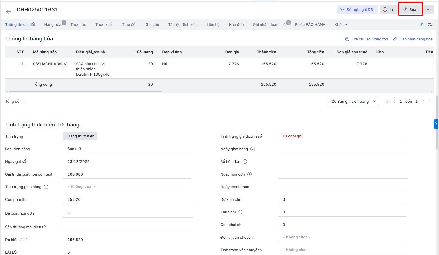 Bước 2: Tại chi tiết đơn hàng cẩn sửa, nhấn Sửa