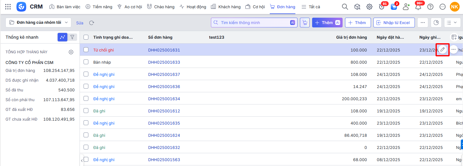 • Hoặc vào phân hệ đơn hàng, tại màn hình danh sách, di chuột vào biểu tượng cây bút để sửa