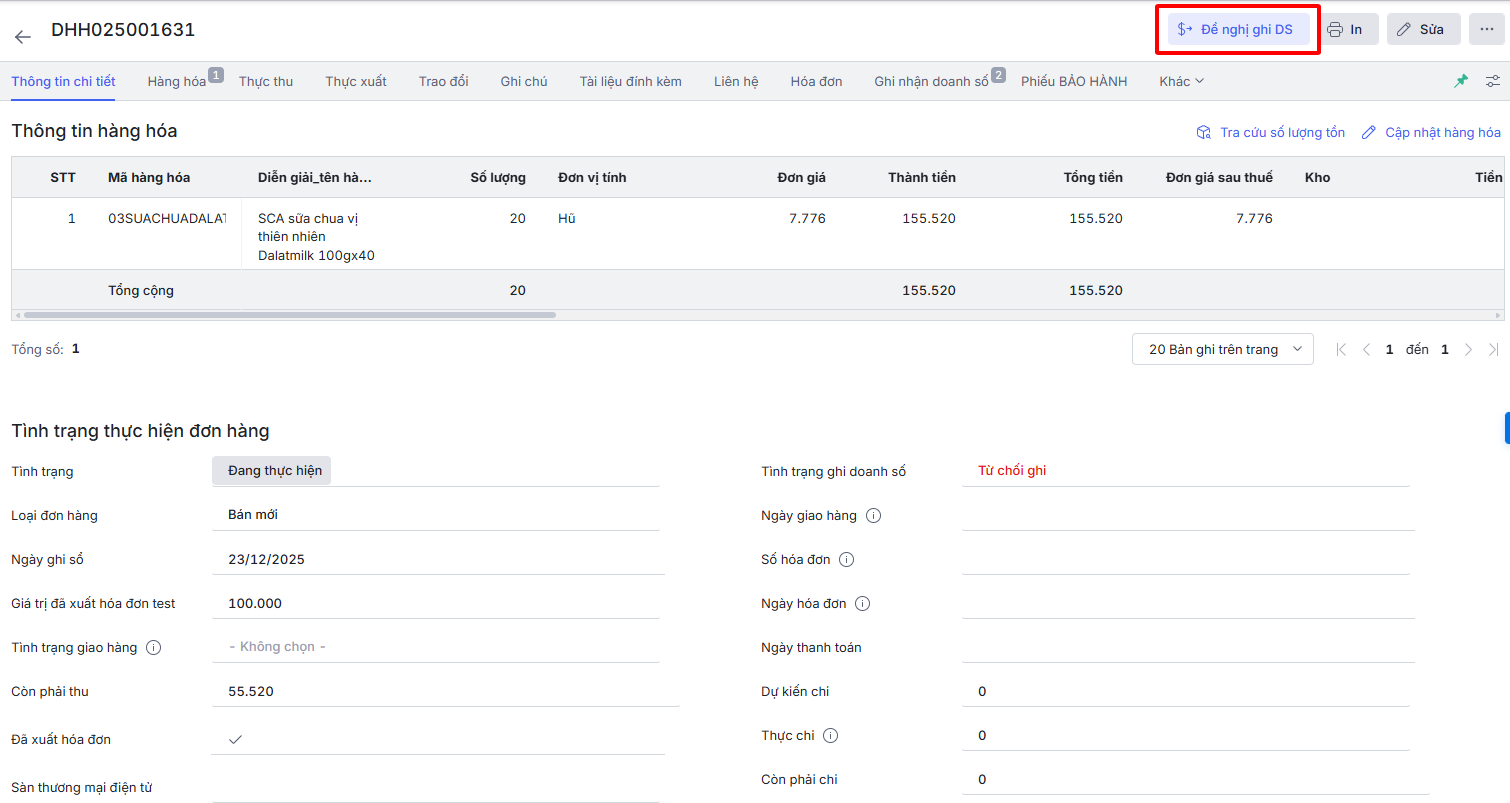 Bước 4: Nhấn Đề nghị ghi DS (hoặc Tại màn hình danh sách Đơn hàng, tích chọn Đơn hàng và chọn Đề nghị ghi DS).
