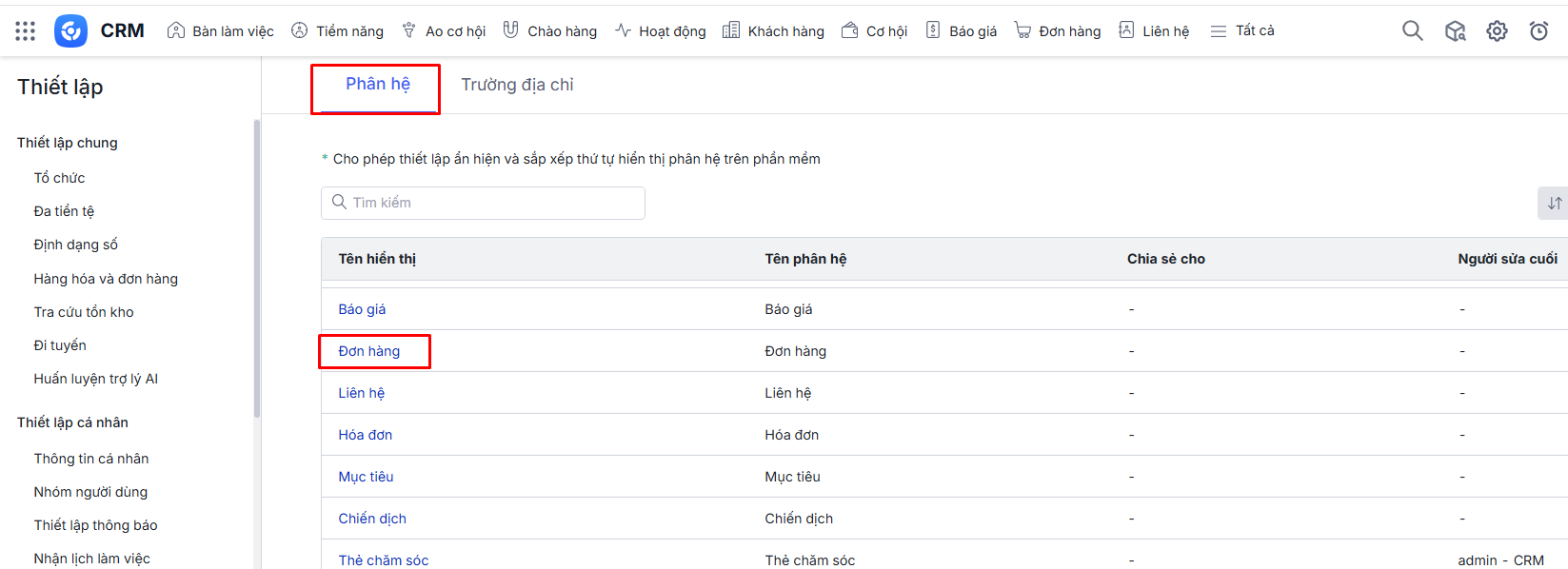 Bước 1: Trên AMIS CRM, nhấn biểu tượng để hiển thị Thiết lập. Vào Tùy chỉnh/Phân hệ và trường.