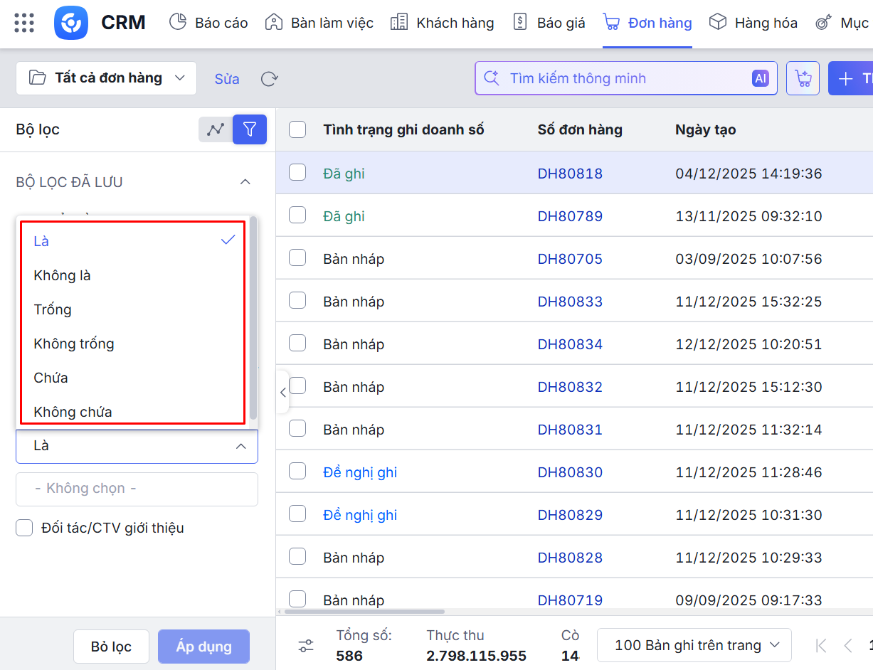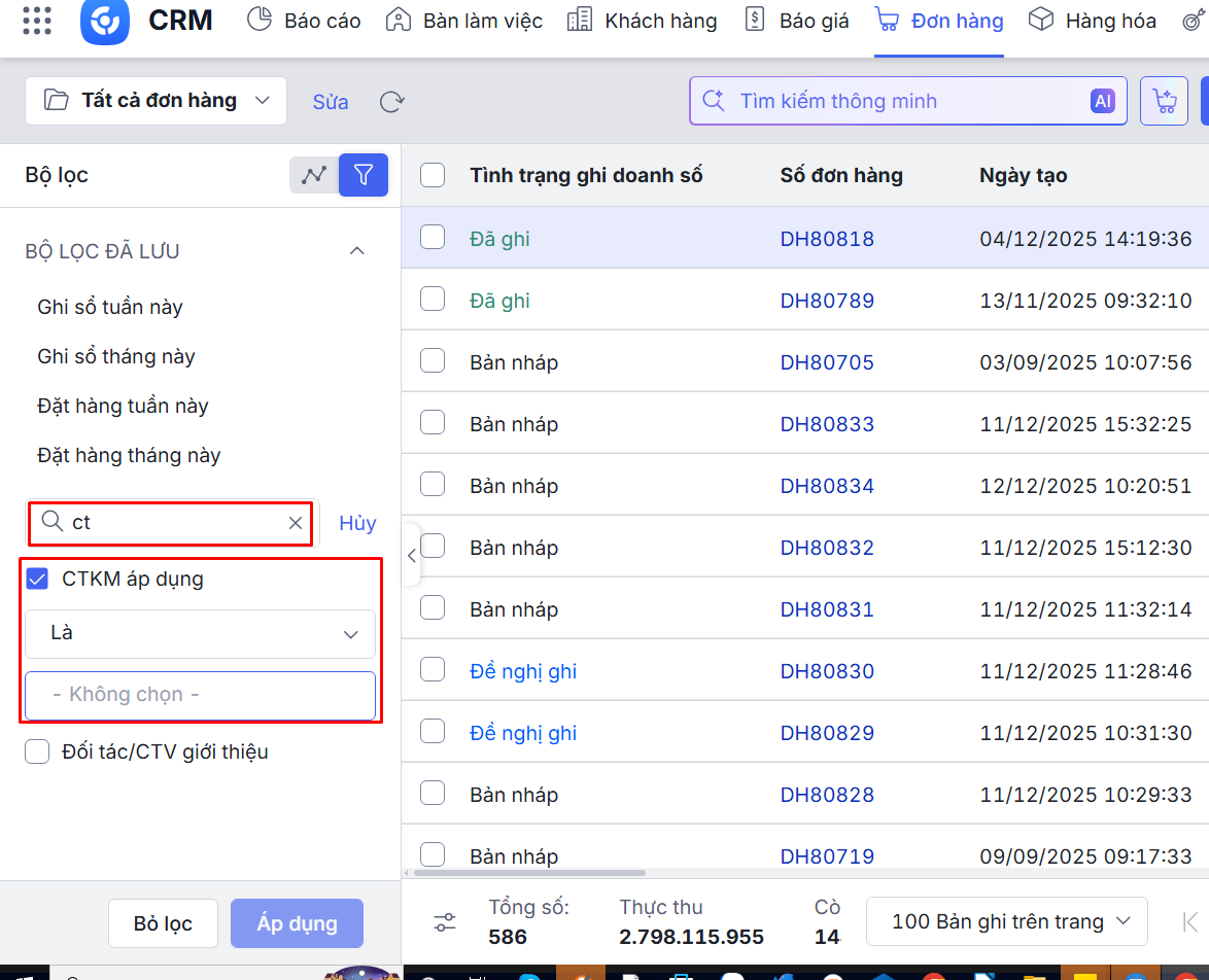 Bước 1: Ở màn hình danh sách Đơn hàng\ Ở thanh lọc bên trái\ Tìm và tích chọn trường CTKM áp dụng:
