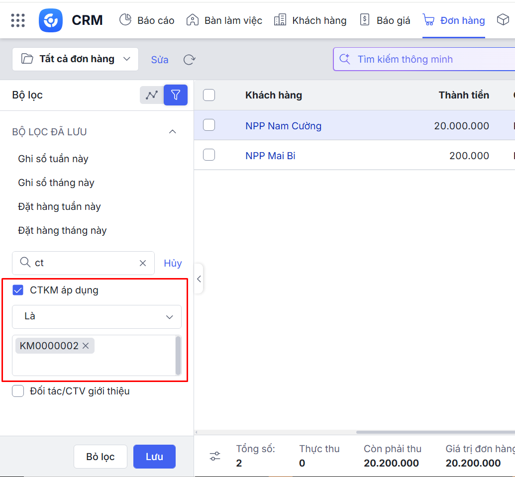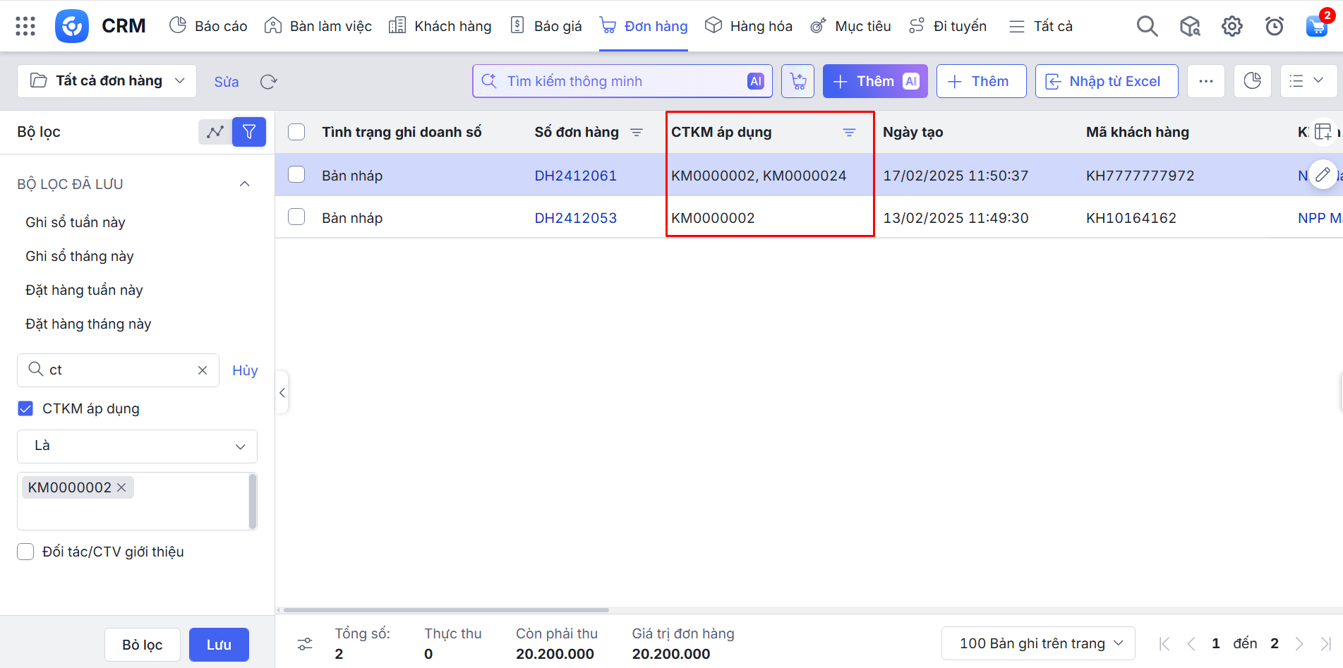 Bước 4: Phần mềm lọc ra những bản ghi Đơn hàng có áp dụng một trong những CTKM được chọn ở điều kiện.