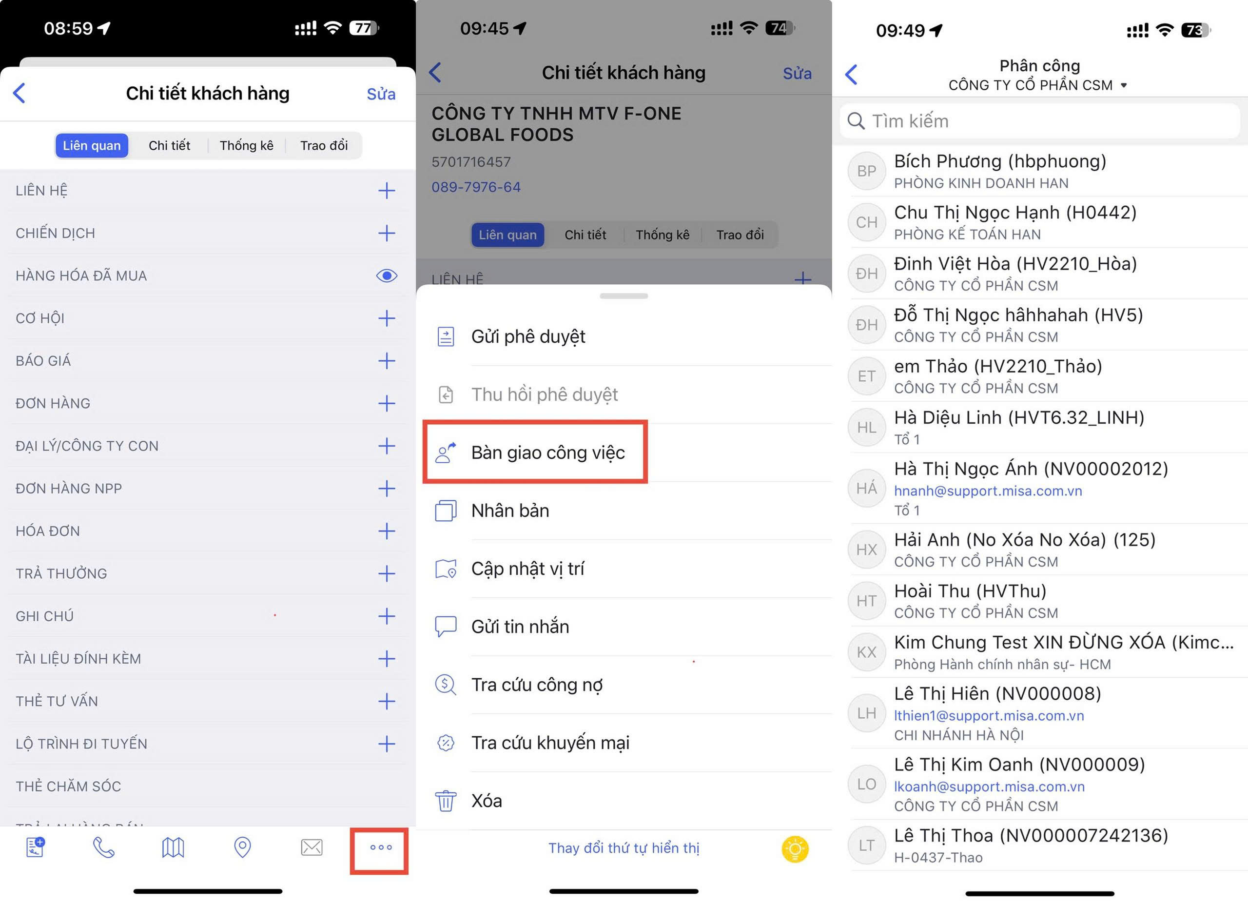 Bài viết hướng dẫn cách phân công bản ghi như Tiềm năng, Liên hệ, Đơn hàng,… cho nhân viên kinh doanh trên ứng dụng AMIS CRM mobile. Nội dung bao gồm các bước thao tác chi tiết từ việc truy cập bản ghi đến chọn nhân viên nhận Bàn giao công việc. Phạm vi áp dụng: người dùng có quyền quản lý trong AMIS CRM.