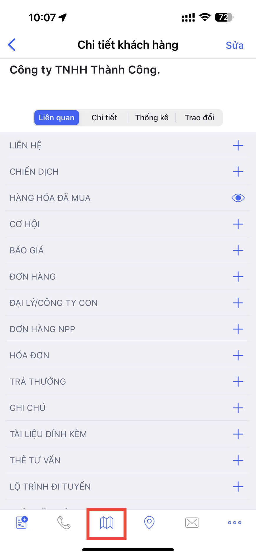 Nội dung bao gồm: các bước thao tác từ màn hình chi tiết bản ghi đến chuyển tiếp sang ứng dụng bản đồ, giúp người dùng nhanh chóng xác định địa chỉ khách hàng và thuận tiện di chuyển trong quá trình làm việc ngoài thị trường.