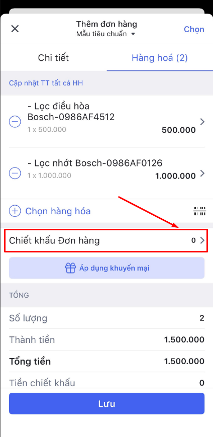 Bước 1: Trên giao diện Thêm mới/Sửa/Sửa nhanh/Nhân bản của Đơn hàng/Báo giá/Hóa đơn tại Mobile ( AMIS CRM 2)\ Tại mục Thông tin hàng hóa\ Chọn Hàng hóa\ Nhấn Chiết khấu đơn hàng.