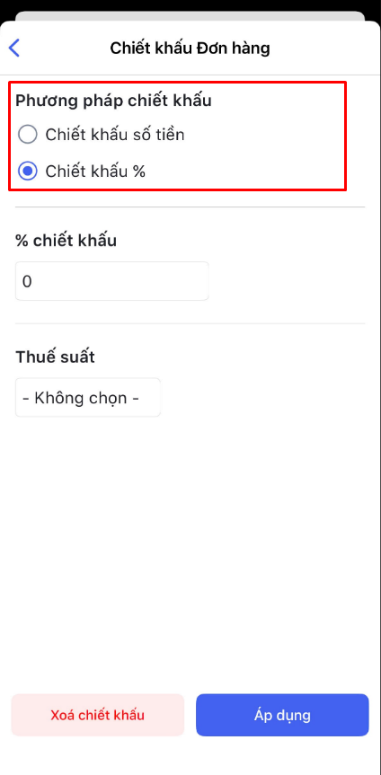 Bước 2: Chọn Phương pháp chiết khấu sử dụng: Chiết khấu số tiền/Chiết khấu %.