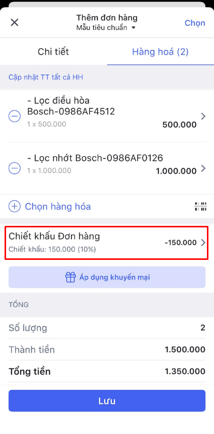 Bước 4: Nhấn Áp dụng\ Phần mềm hiển thị số tiền chiết khấu trên tổng giá trị đơn hàng.