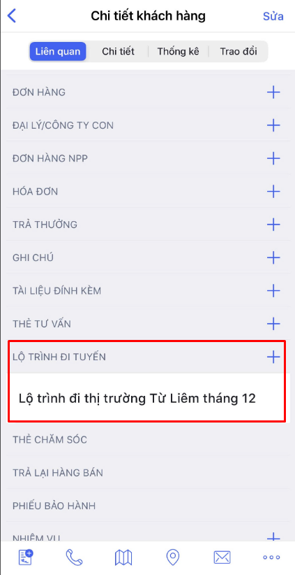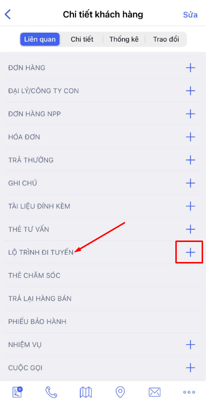 Bước 1: Ở chi tiết bản ghi Khách hàng/Tiềm năng/Liên hệ\ tại Danh sách liên quan Lộ trình đi tuyến\ Nhấn biểu tượng dấu cộng