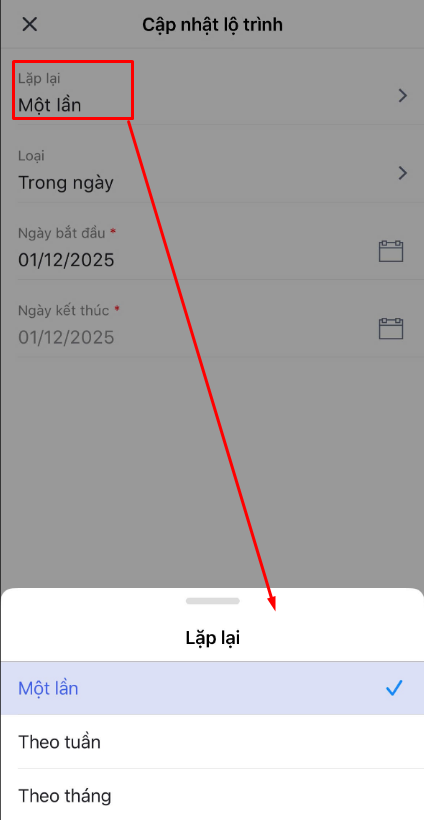 Bước 3: Các thông tin Ngày bắt đầu, Ngày kết thúc, Lặp lại hiển thị theo thông tin của Lộ trình đi tuyến đã chọn\ Có thể sửa lại các thông tin (nếu cần).