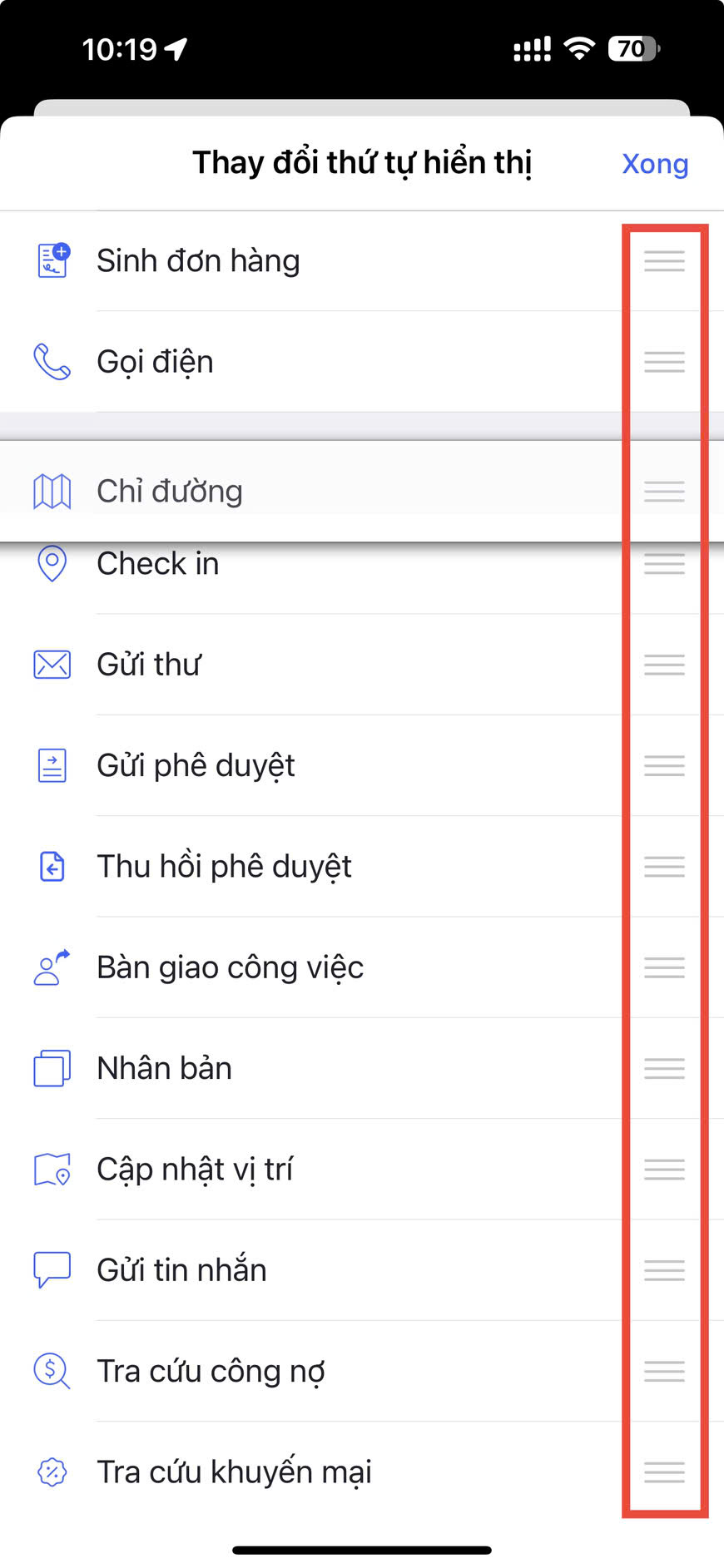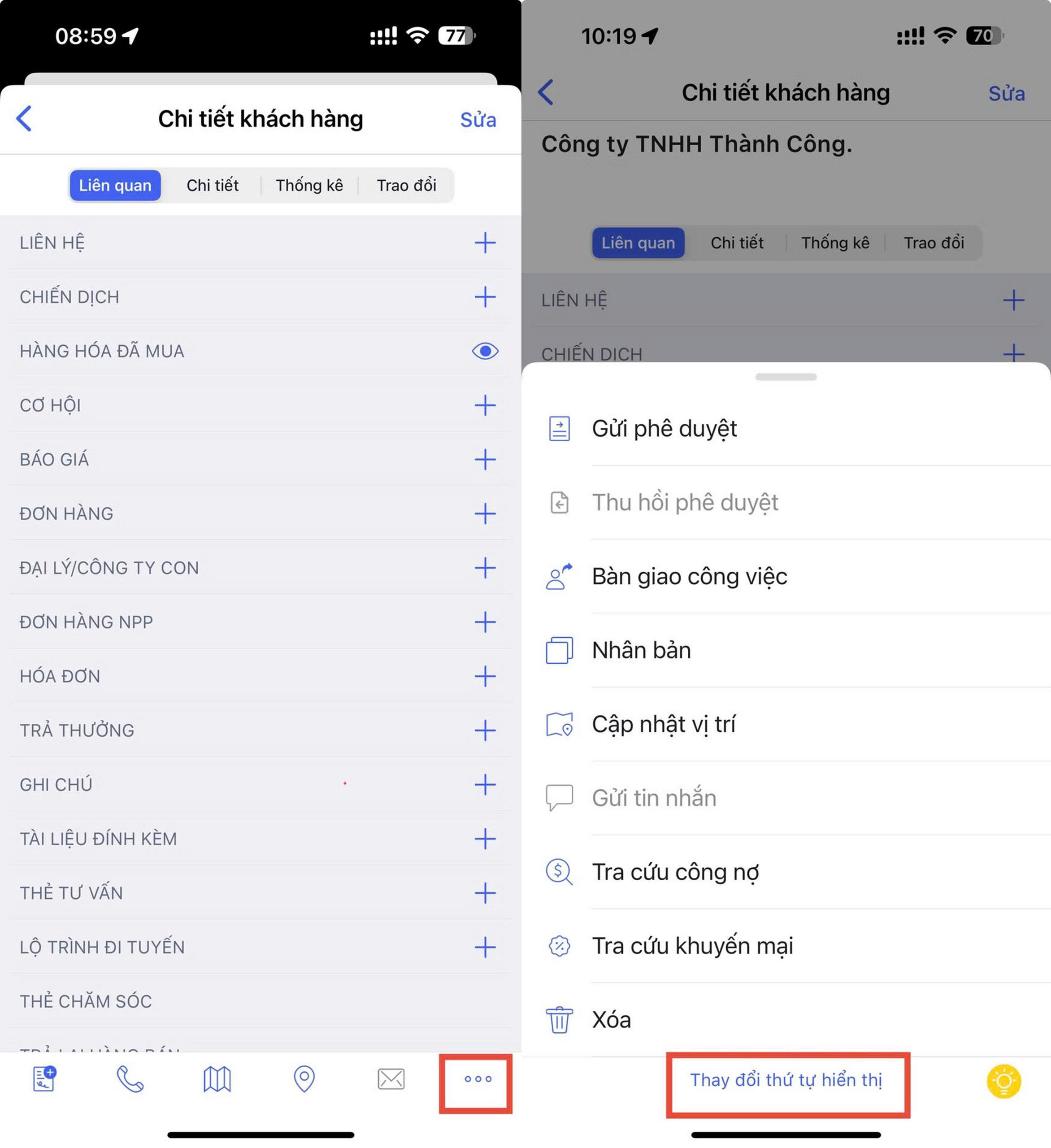 Bài viết hướng dẫn cách thay đổi thứ tự hiển thị các chức năng trong chi tiết bản ghi trên ứng dụng AMIS CRM mobile.