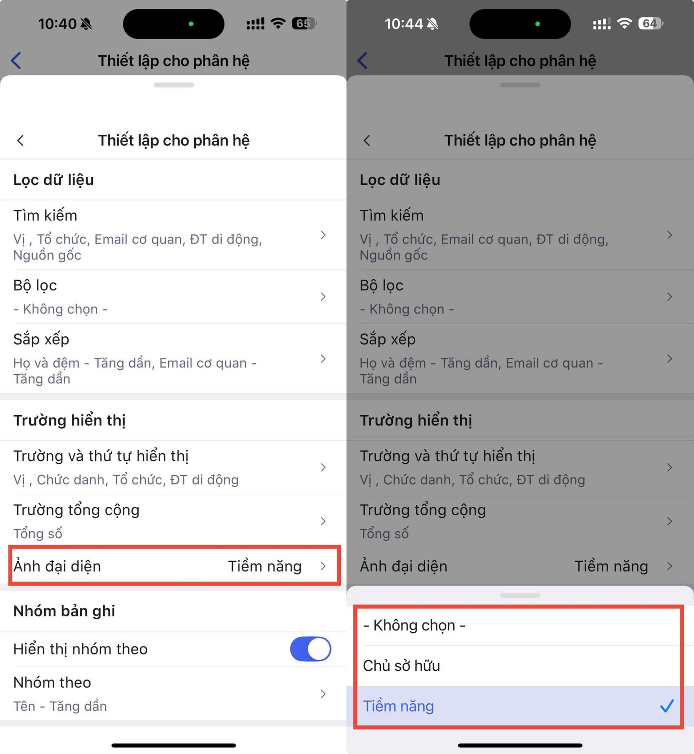 - Lựa chọn ảnh đại diện của bản ghi: Không chọn (không hiển thị ảnh đại diện trên danh sách), Ảnh của Chủ sở hữu, Ảnh của Tiềm năng/Liên hệ/Hàng hóa.