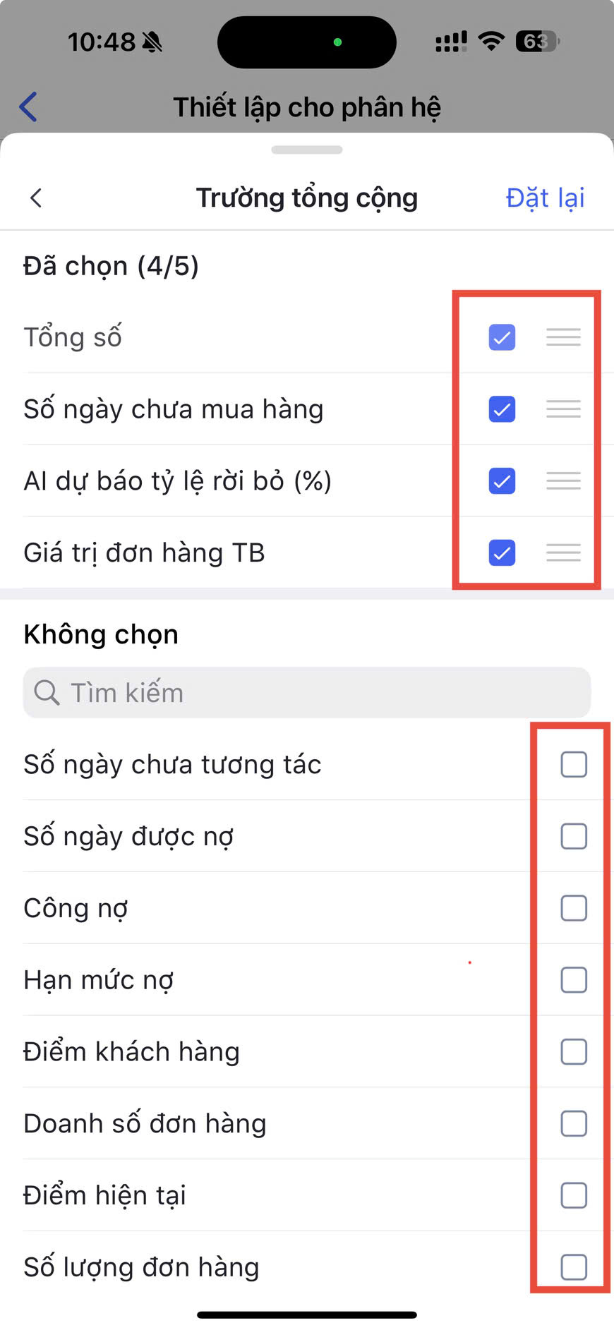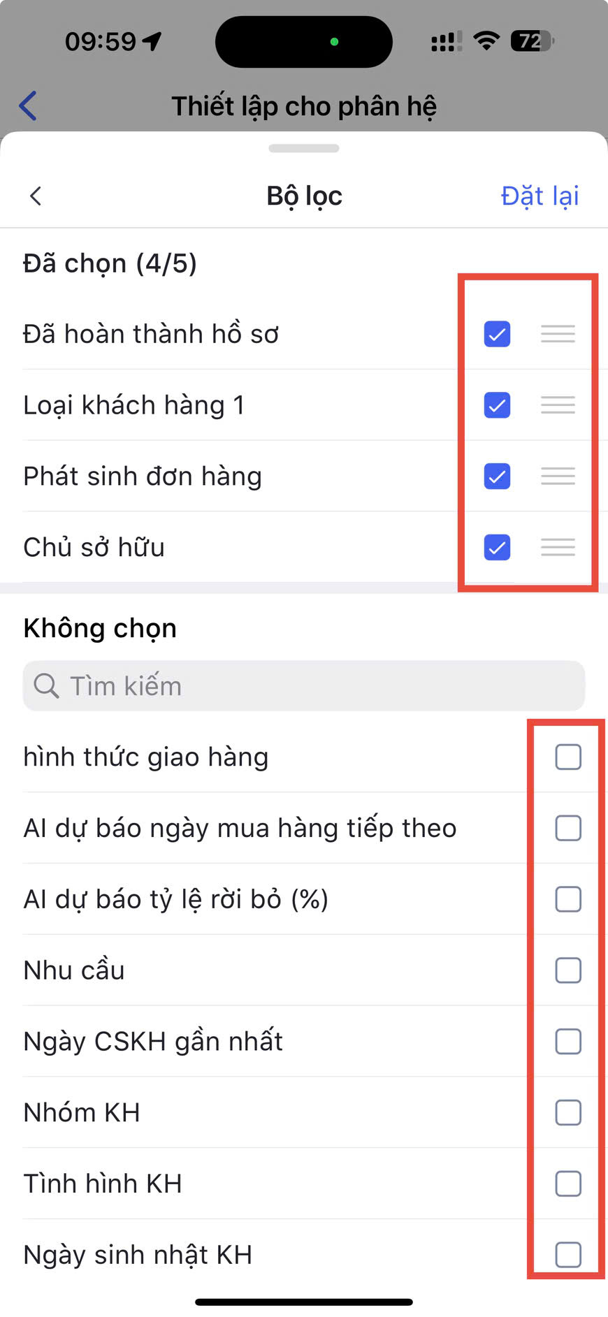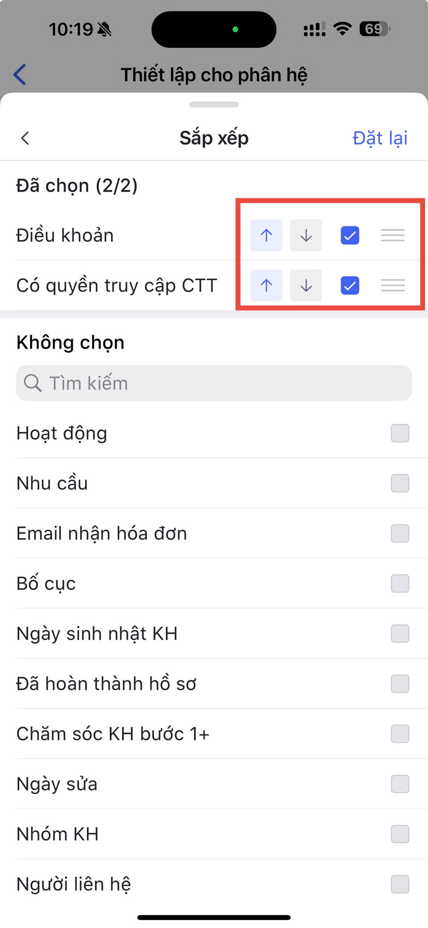 - Để sắp xếp thứ tự hiển thị các trường trong bộ lọc, nhấn giữ và kéo biểu tượng