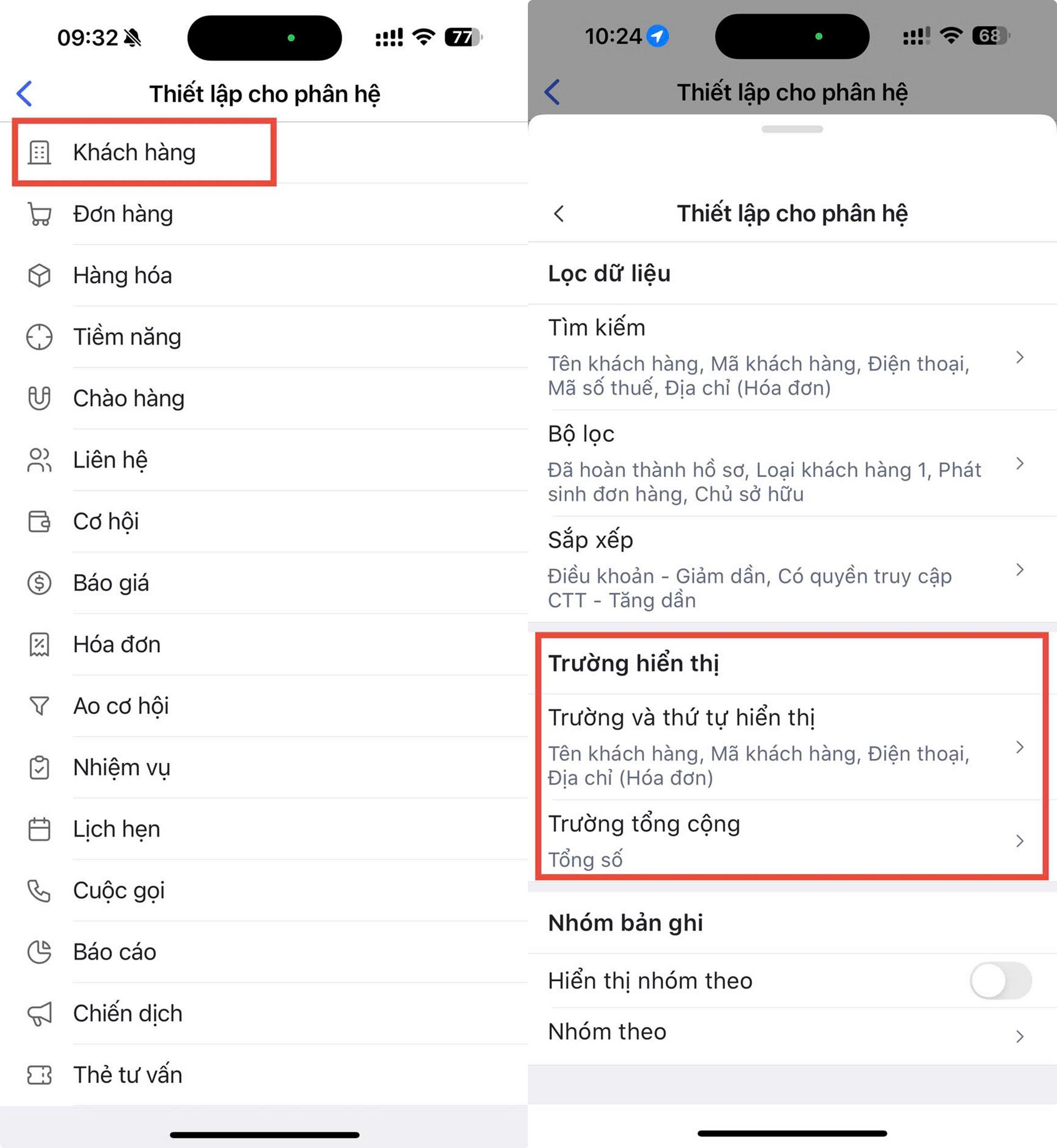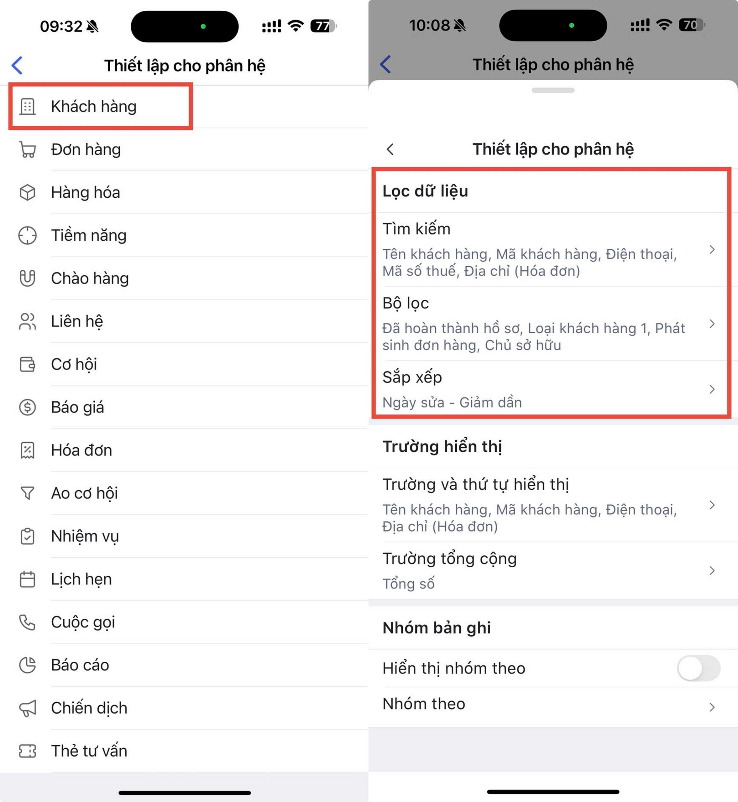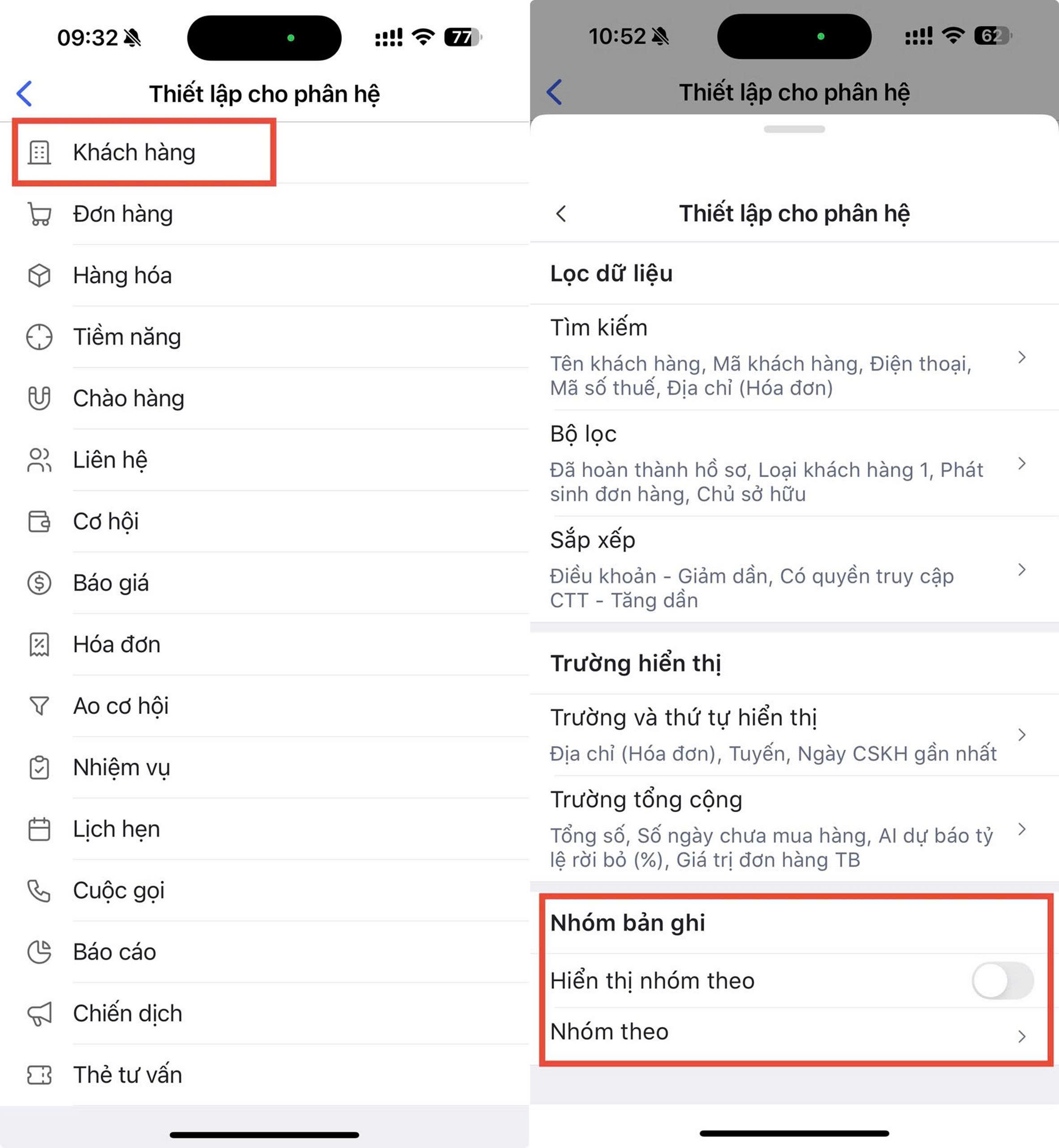 Bước 2: Trên các phân hệ, ví dụ phân hệ Khách hàng \ tại mục Nhóm bản ghi: