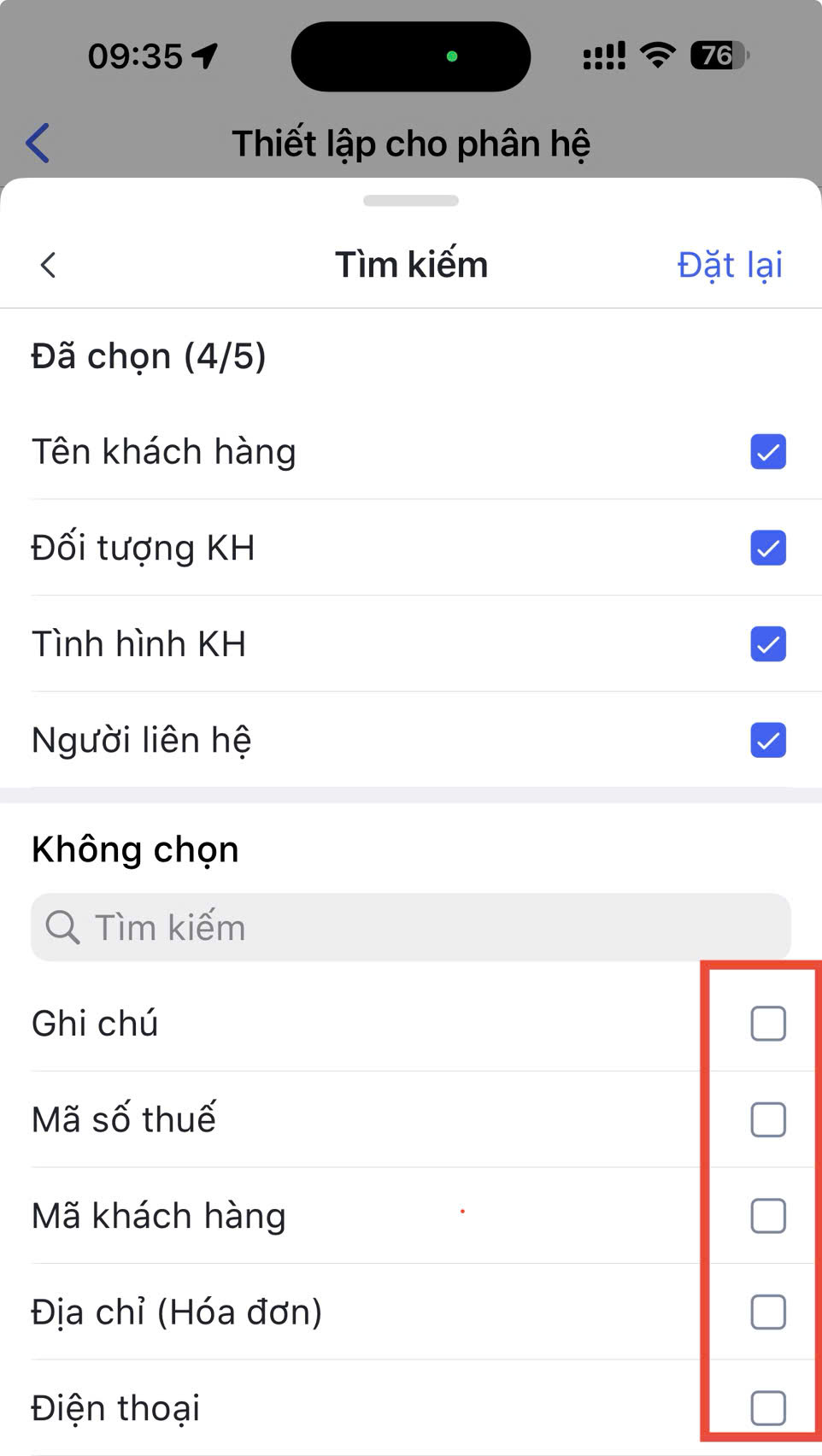 - Các trường thông tin được tích chọn sẽ chuyển từ mục Không chọn thành Đã chọn.