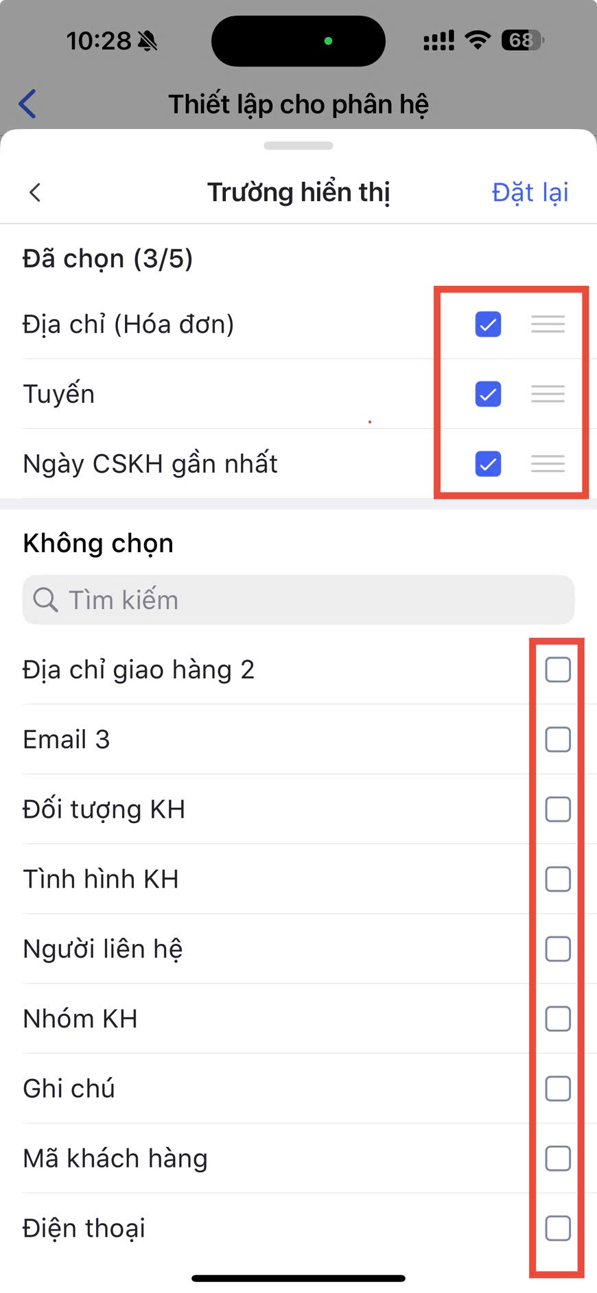 - Để sắp xếp thứ tự hiển thị các trường, nhấn giữ và kéo biểu tượng