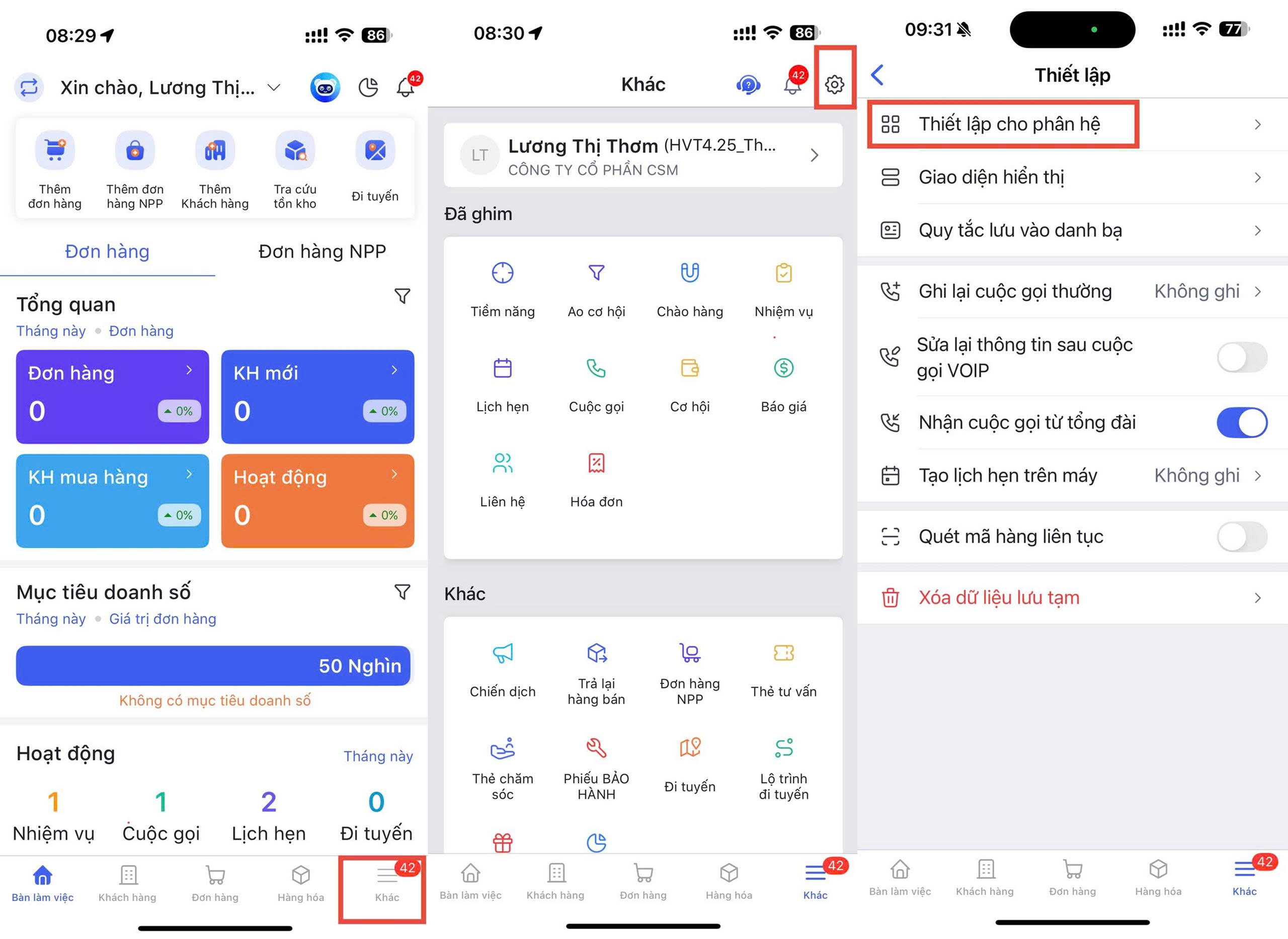 Bước 1: Trên phần mềm AMIS bán hàng Mobile, vào biểu tượng Khác phía dưới góc phải \ nhấn biểu tượng bánh răng \ vào Thiết lập cho phân hệ.