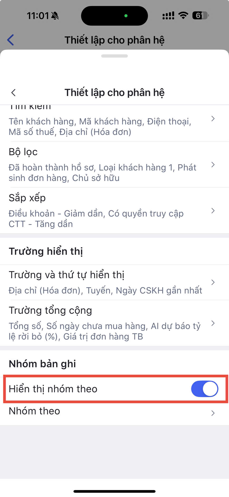 - Ở mục Nhóm bản ghi, tại dòng Hiển thị nhóm theo: Nhấn Bật/Tắt để lựa chọn hiển thị/không hiển thị các bản ghi theo nhóm.