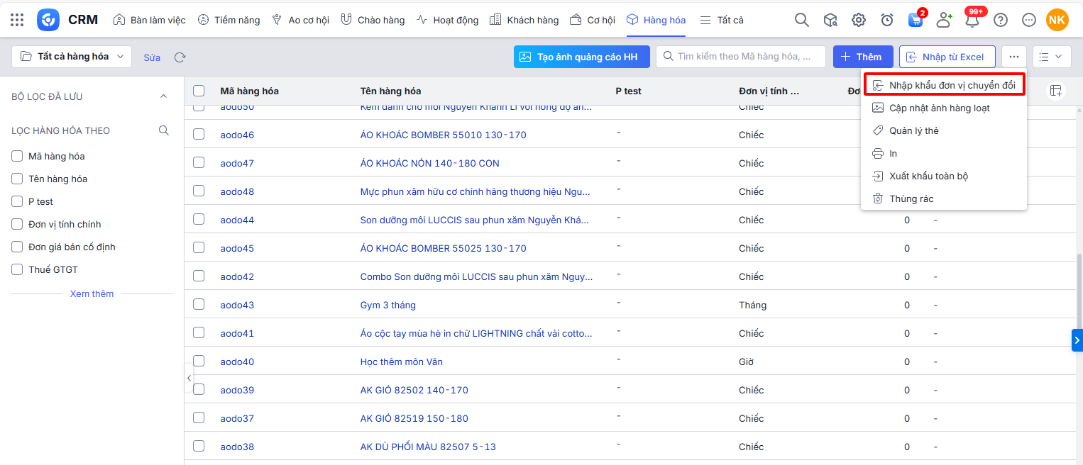 - Không hỗ trợ nhập khẩu đơn vị tính chuyển đổi cho bộ hàng hóa.