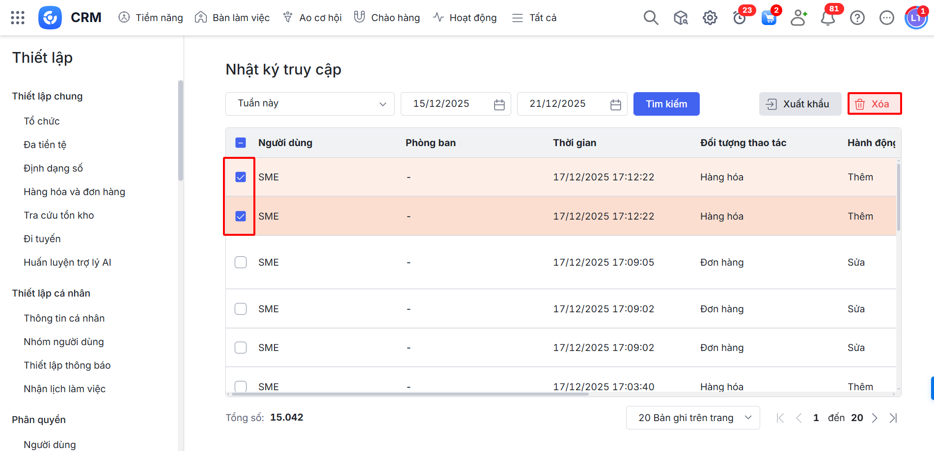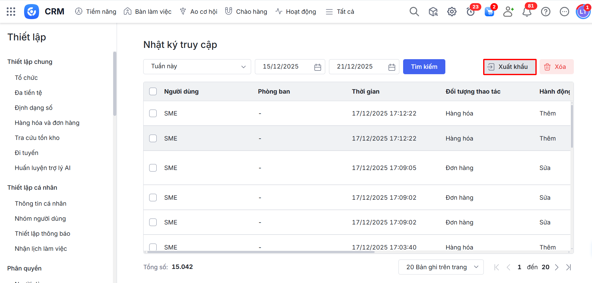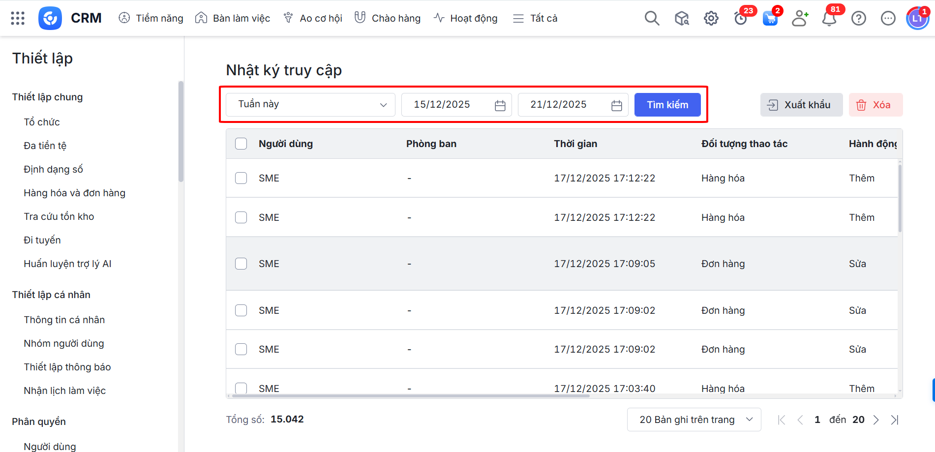 Bài viết hướng dẫn cách tra cứu và quản lý nhật ký truy cập trên AMIS CRM, bao gồm thao tác lọc, xuất khẩu và xóa nhật ký. Phạm vi áp dụng cho người dùng có quyền truy cập chức năng này.