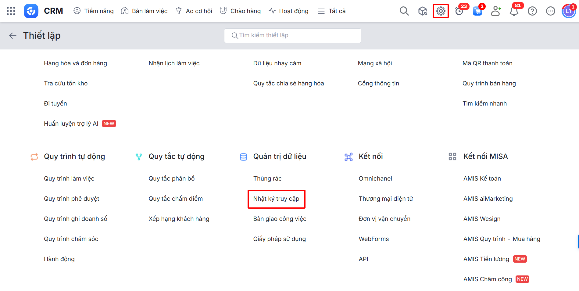 Bước 1: Trên AMIS CRM, nhấn biểu tượng bánh răng