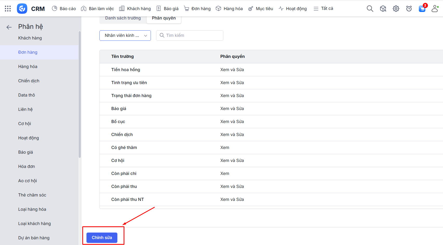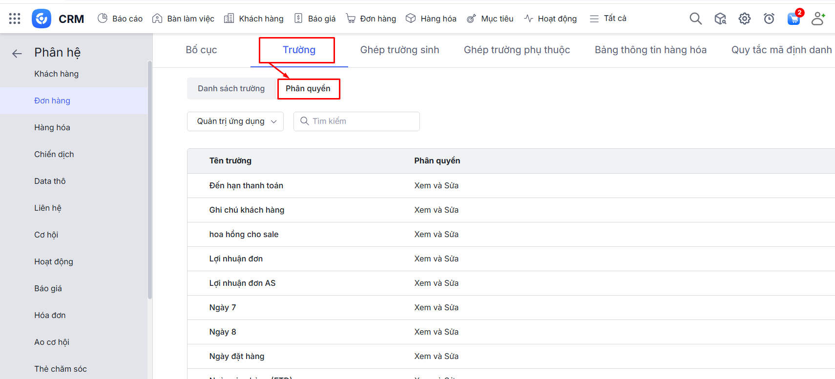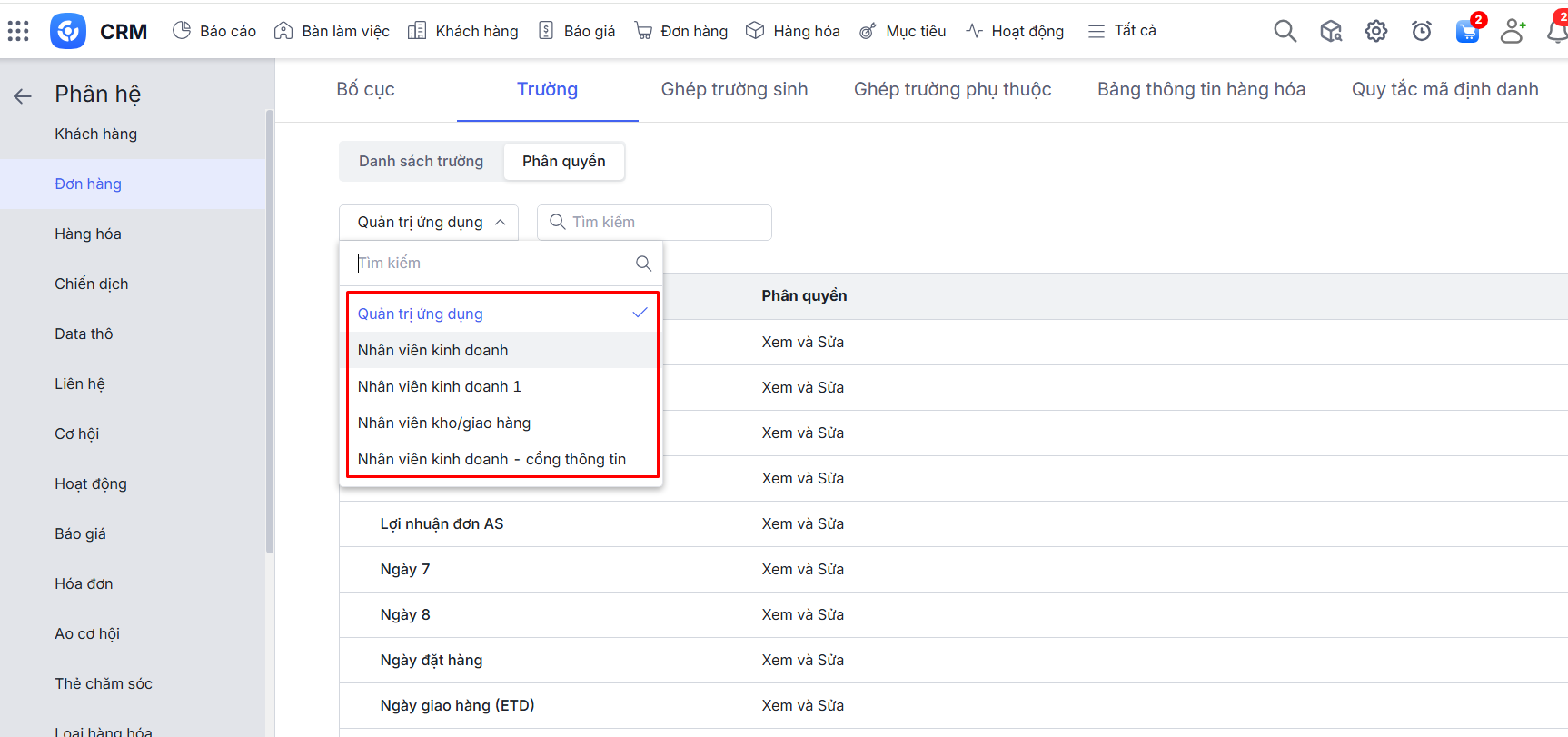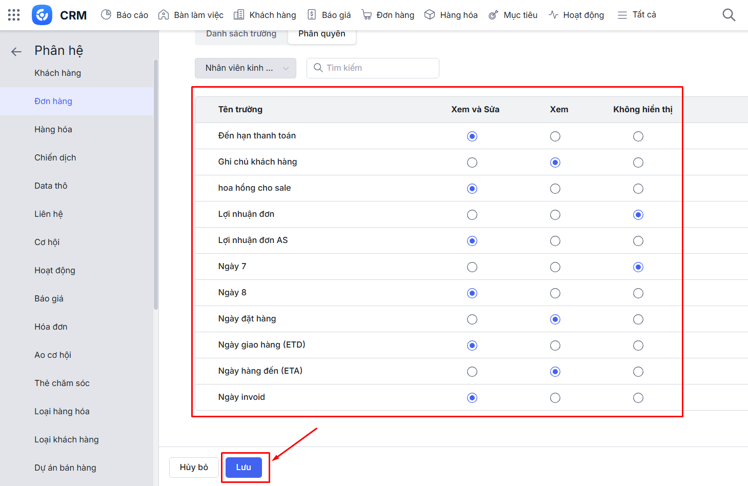 Bước 6: Ở từng trường thông tin\ Chọn quyền thao tác đối với trường thông tin đó của vai trò: Xem và Sửa/Xem/Không hiển thị.