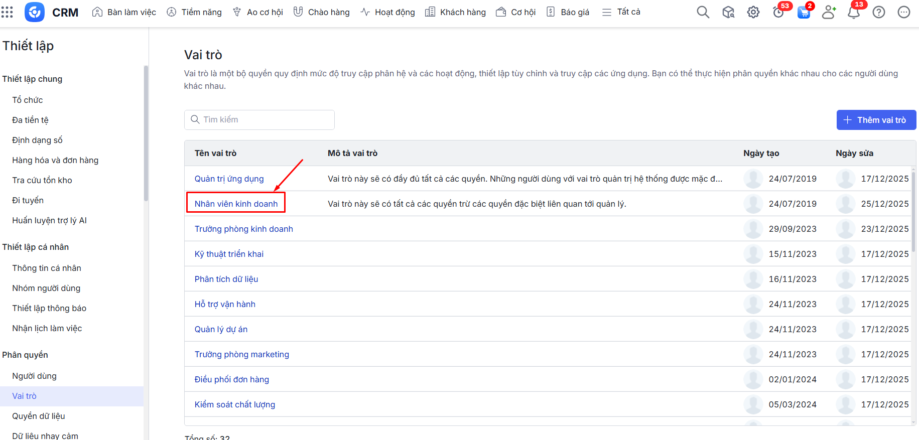 Bước 1: Vào biểu tượng bánh răng\ Thiết lập\ Phân quyền\ Vai trò\ Chọn vai trò cần thiết lập chức năng chia sẻ.