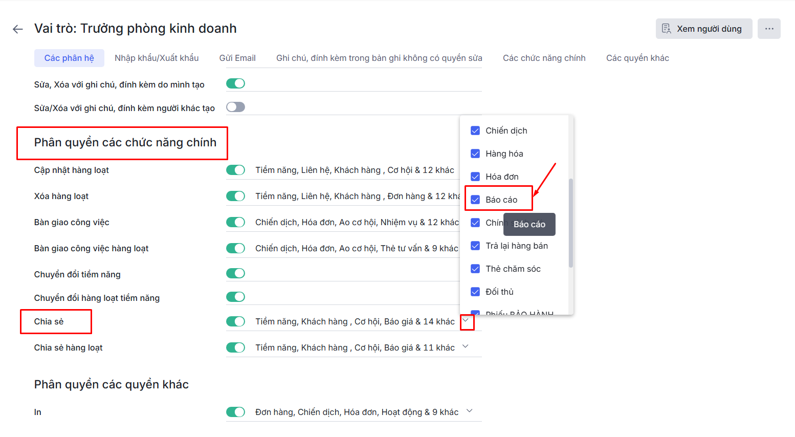 Bước 2: Tại mục Phân quyền các chức năng chính\ Chia sẻ\ Tích chọn để vai trò có quyền chia sẻ báo cáo hoặc bỏ tích chọn để vai trò không có quyền chia sẻ báo cáo.