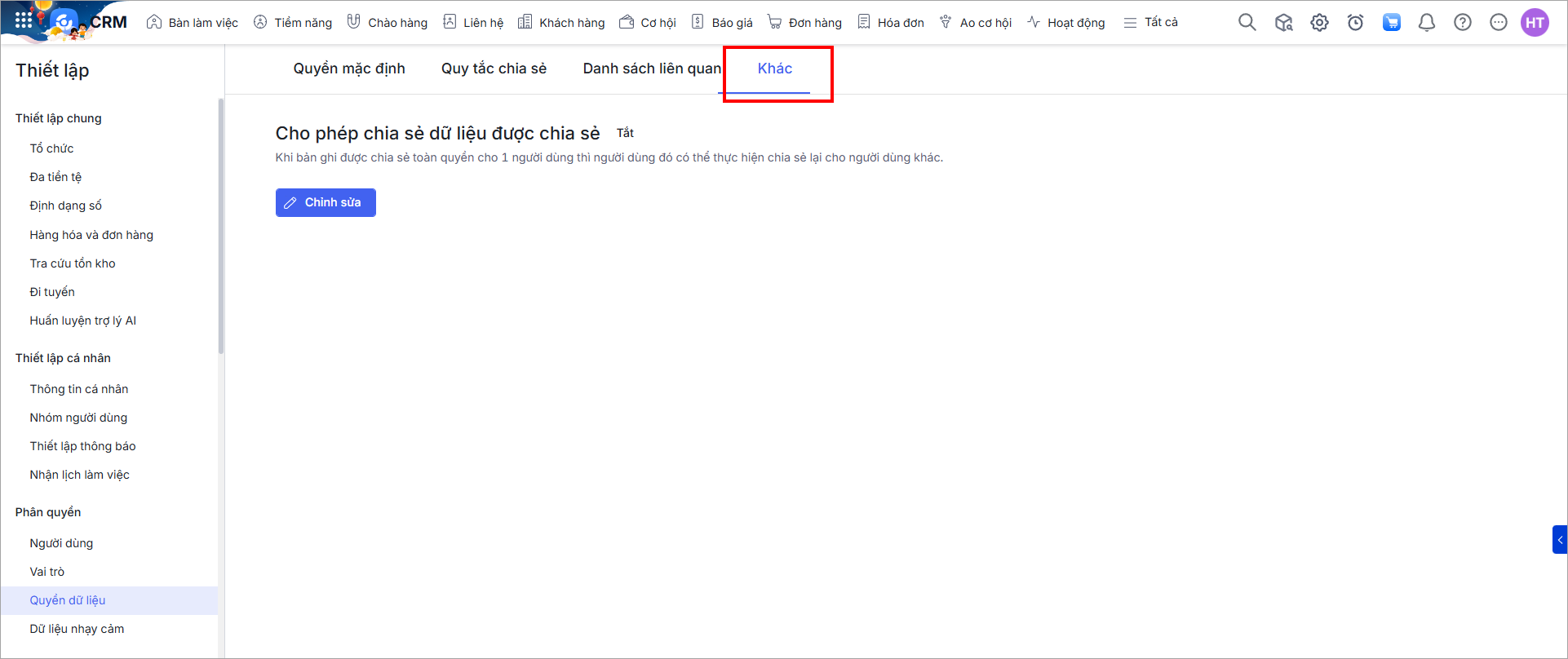 Trên giao diện AMIS CRM, nhấn vào biểu tượng để hiển thị Thiết lập. Vào Phân quyền\Quyền dữ liệu.