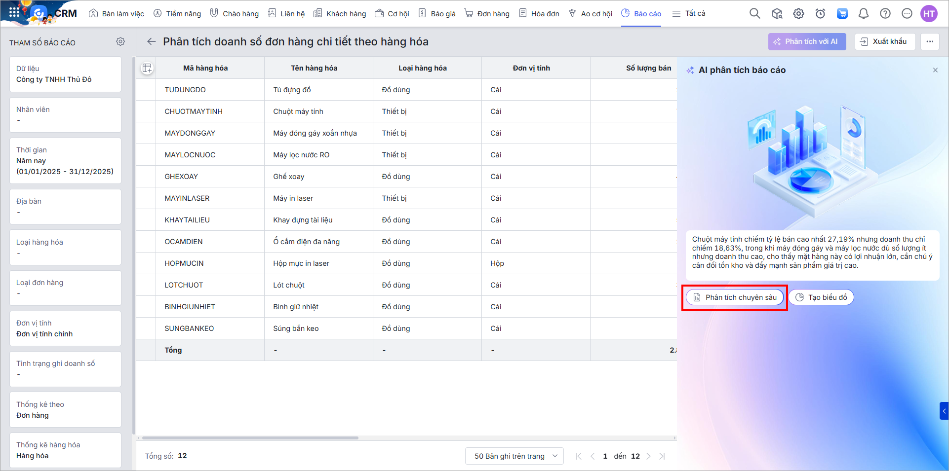 Ở giao diện AI phân tích báo cáo, nhấn Phân tích chuyên sâu.