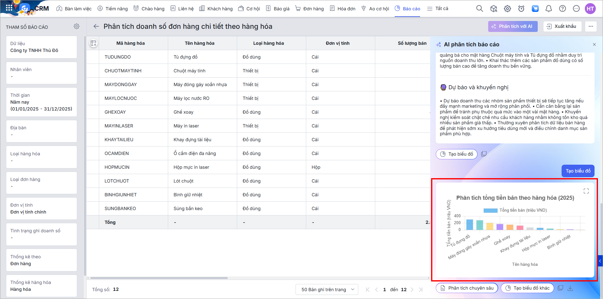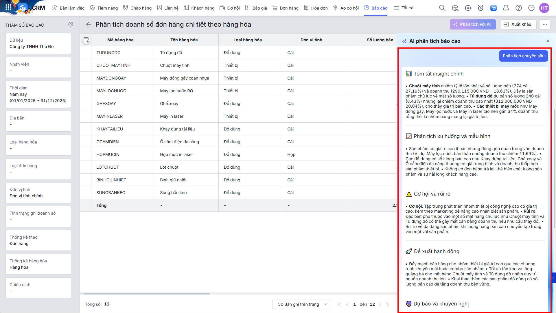 AMIS CRM tích hợp AI vào từng báo cáo giúp phân tích số liệu, tạo biểu đồ trực quan nhằm hỗ trợ doanh nghiệp ra quyết định nhanh chóng và hiệu quả hơn.