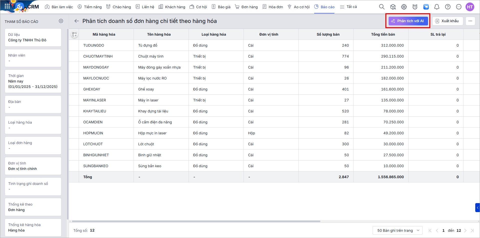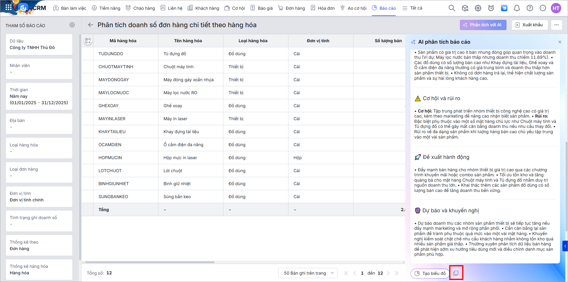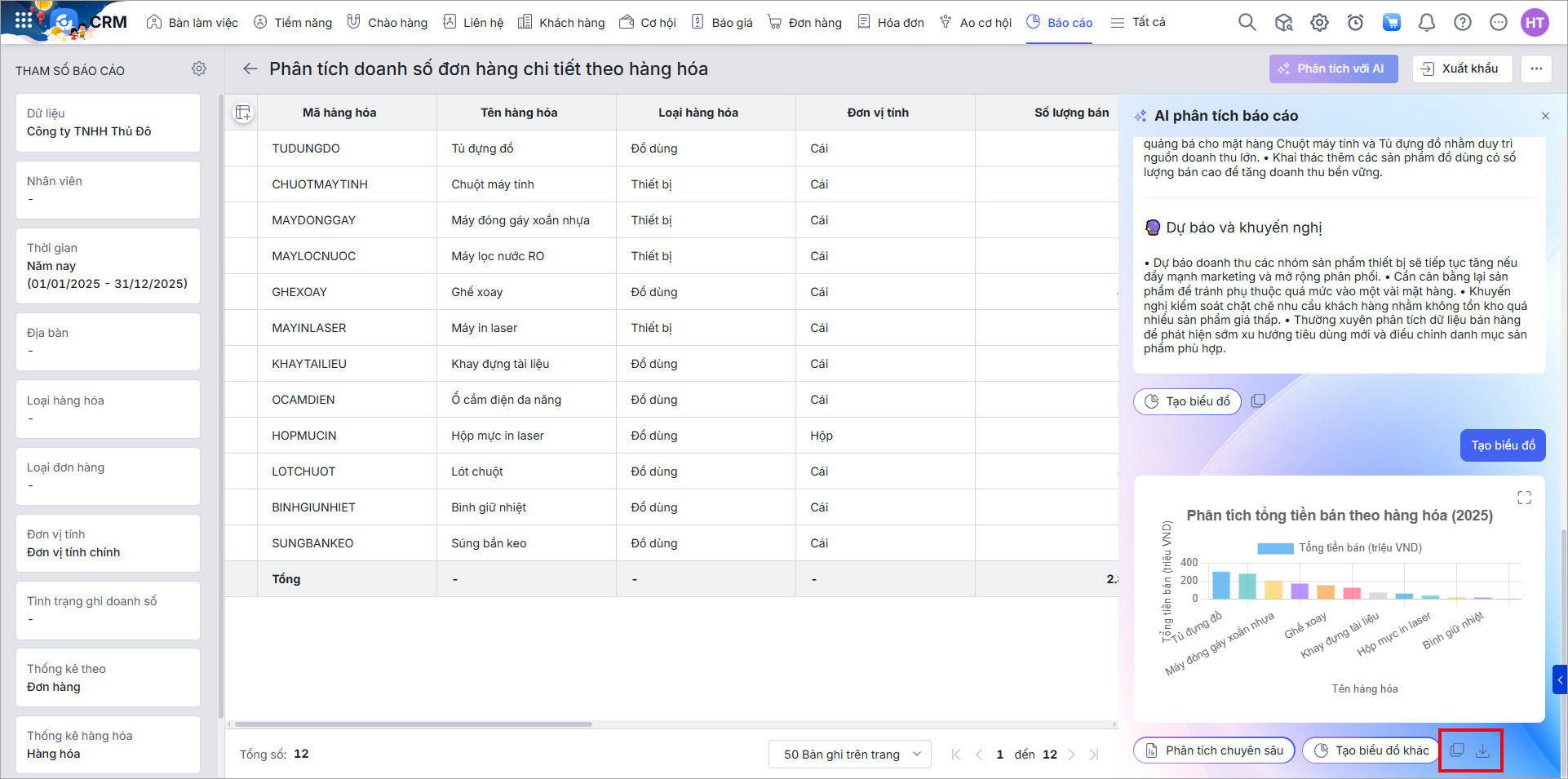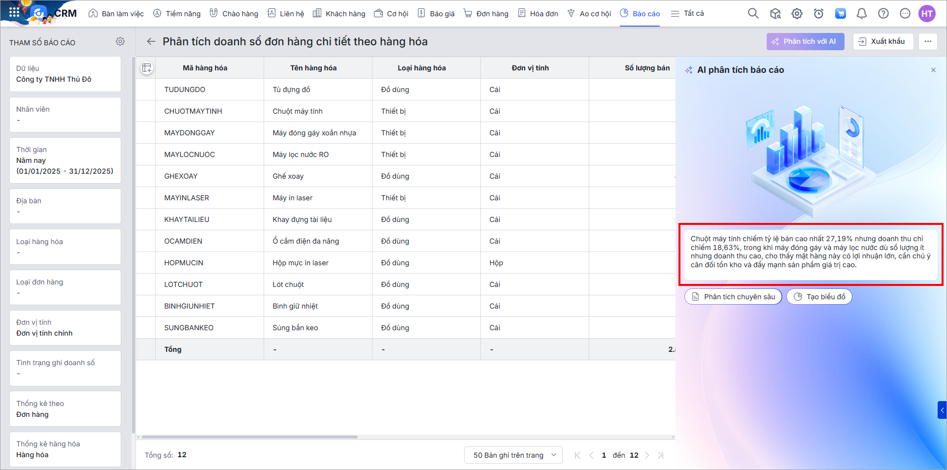 Ở giao diện chi tiết của từng báo cáo, nhấn Phân tích với AI.