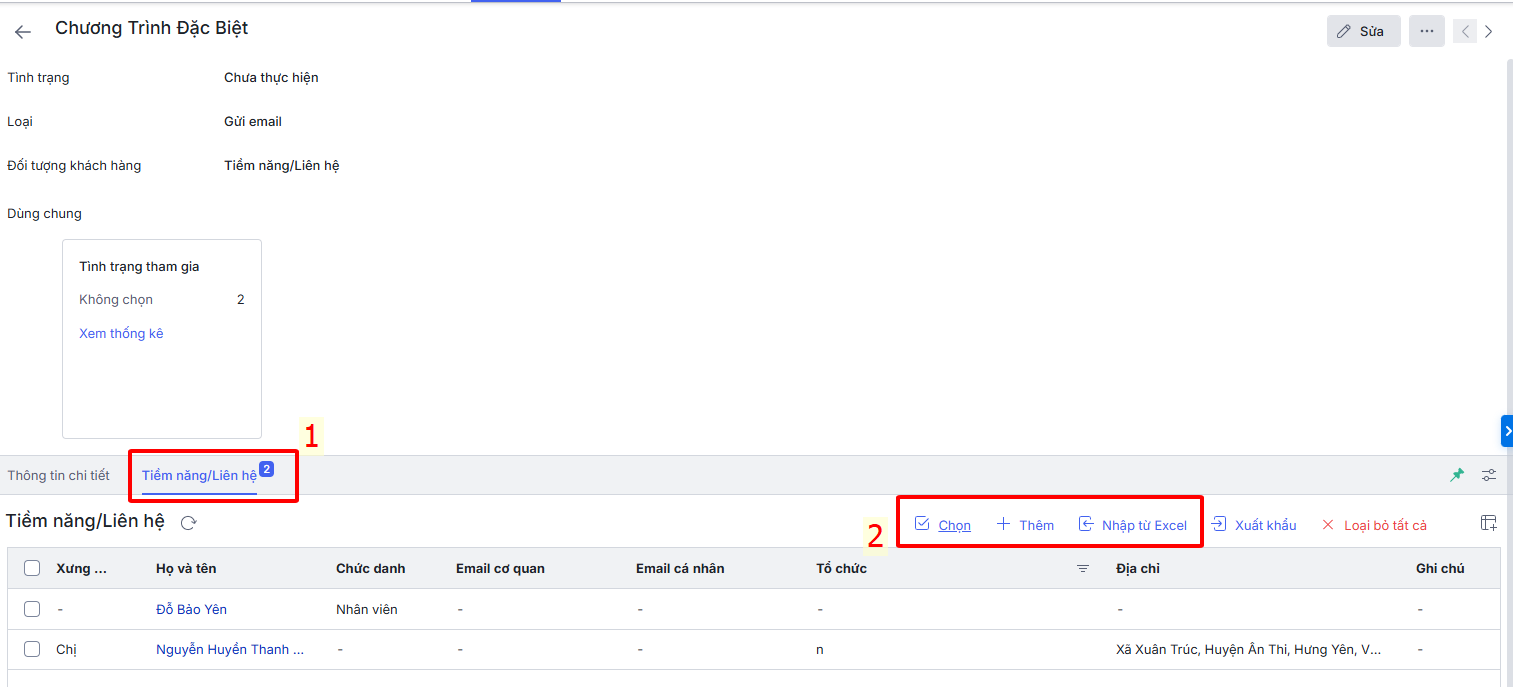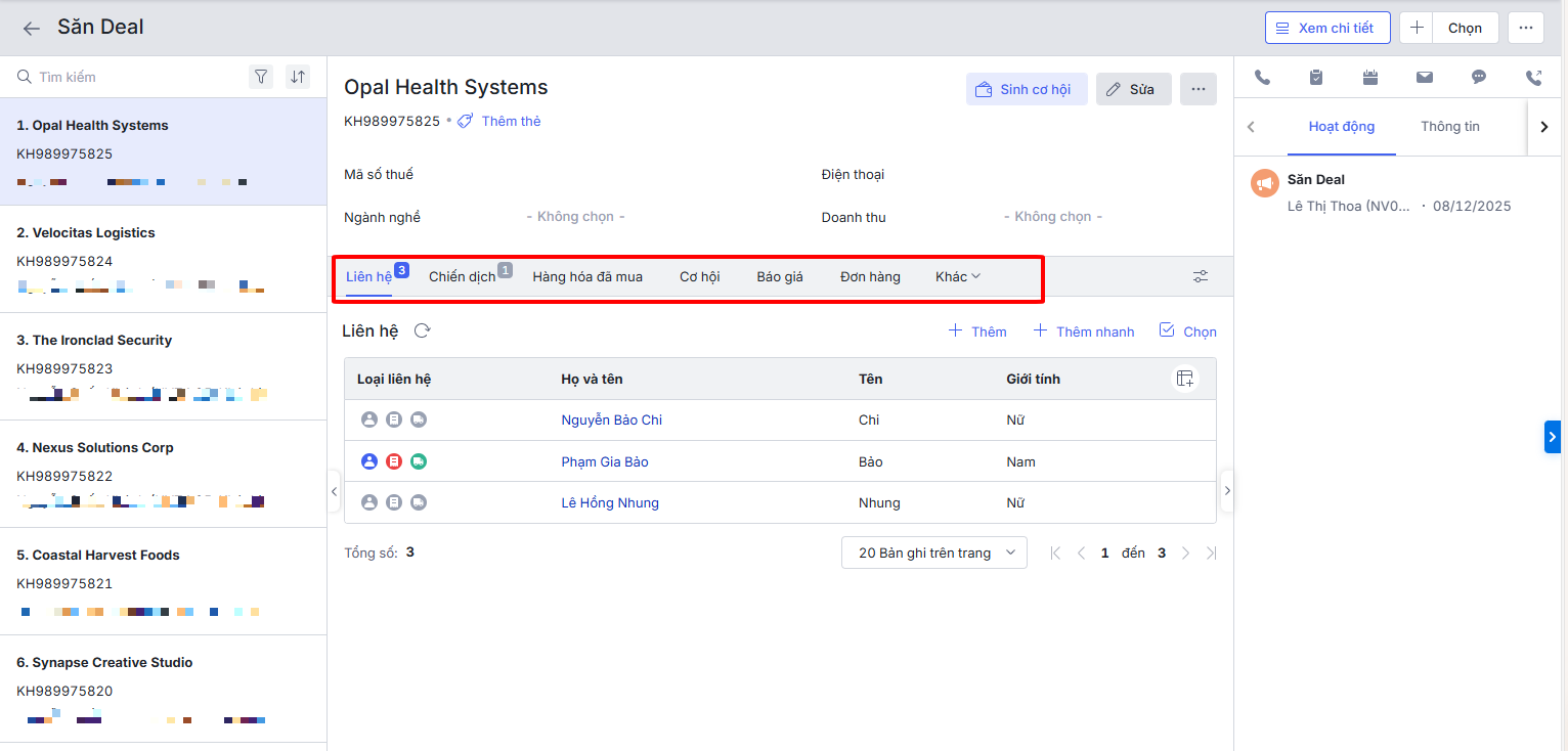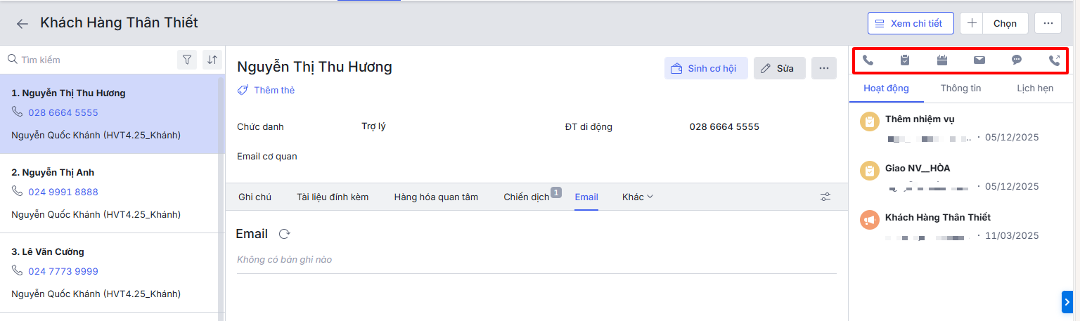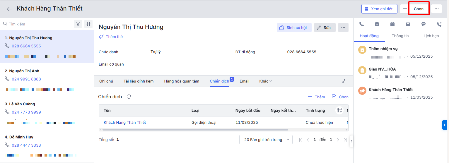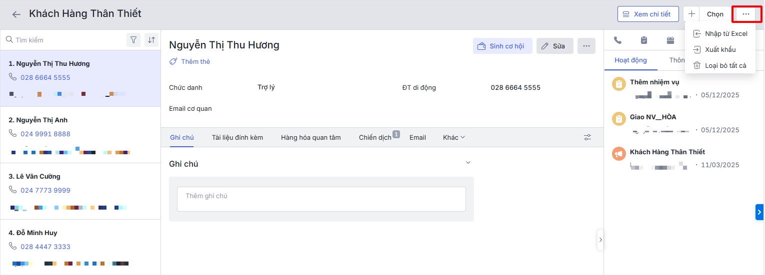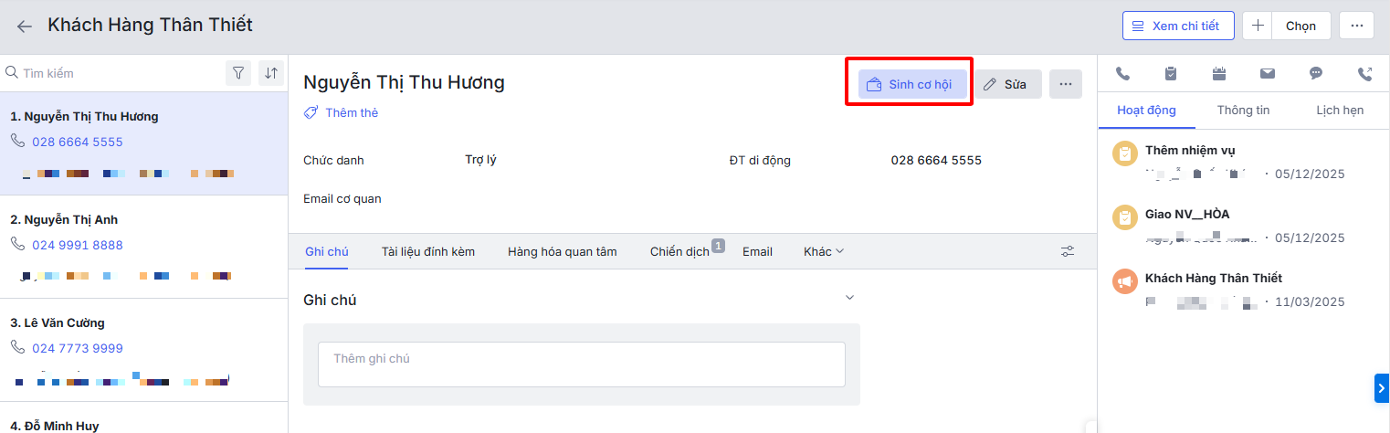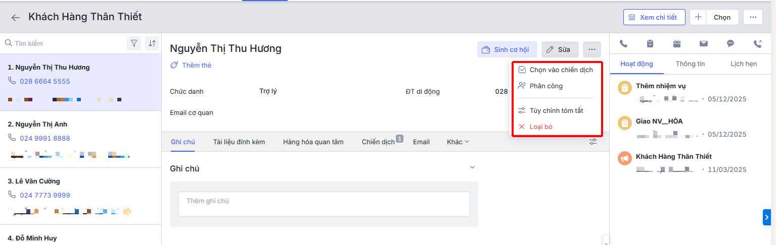 - Quản lý danh sách khách hàng trong Chào hàng: thêm, lọc, nhập khẩu, xuất khẩu, loại bỏ, sinh cơ hội, chọn vào chiến dịch, phân công, lịch sử giao dịch, thêm nhanh các nghiệp vụ liên quan