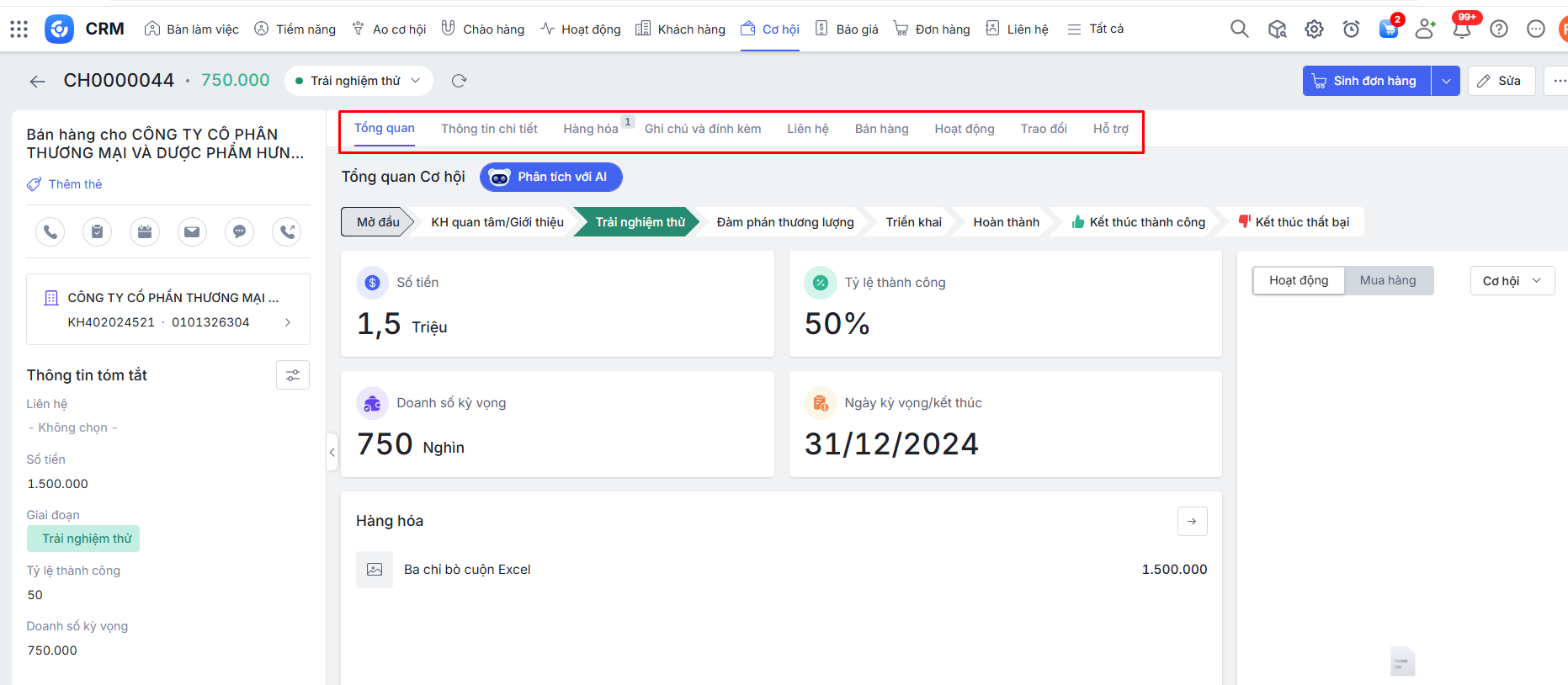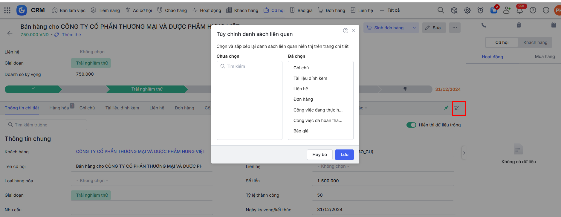 Tại chi tiết bản ghi Cơ hội, trong phần Danh sách liên quan: