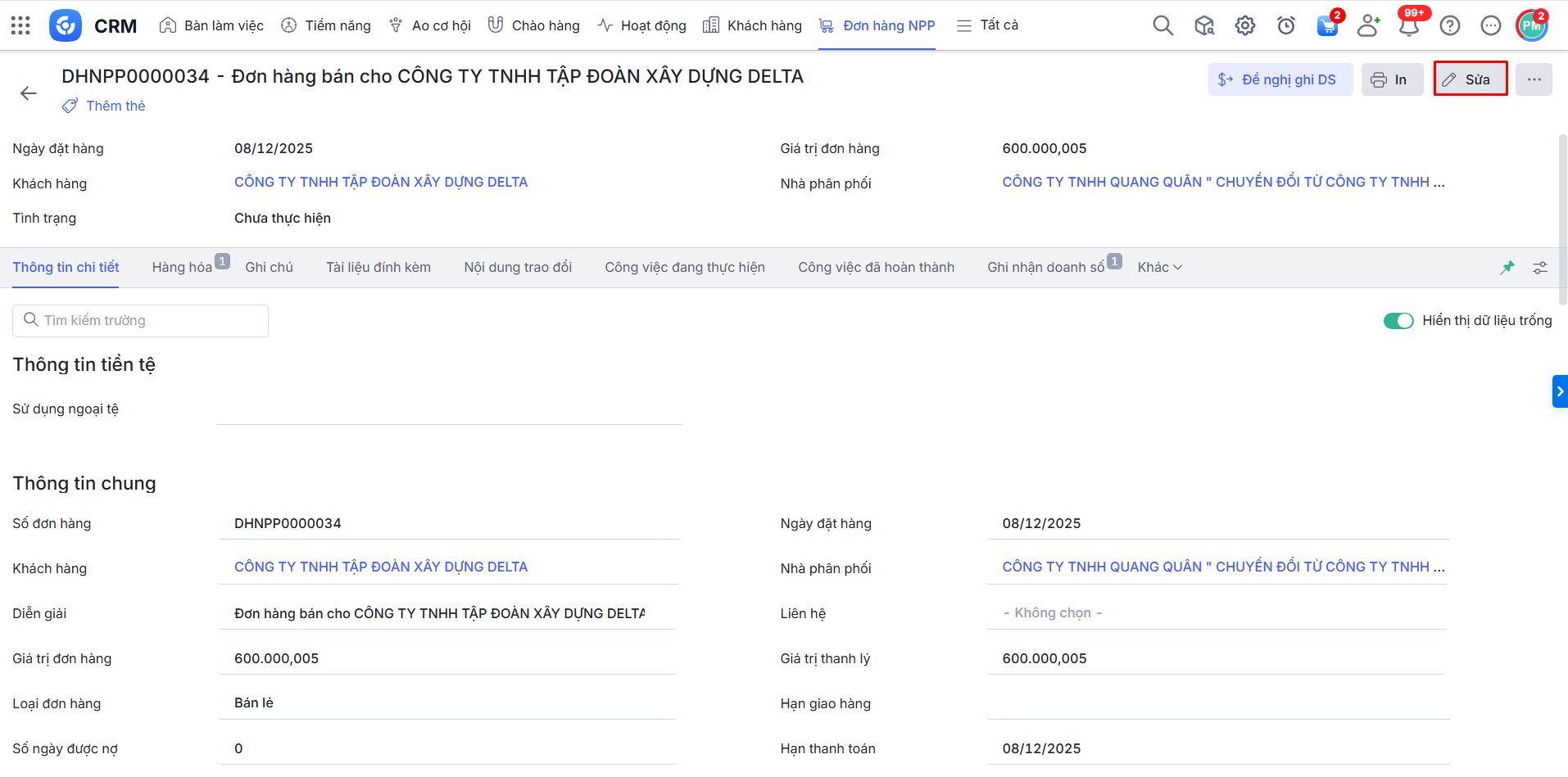 Bước 1: Tại giao diện danh sách Đơn hàng tại phân hệ Đơn hàng NPP\Nhấn đúp chuột vào 1 đơn hàng\Ở chi tiết Đơn hàng NPP\Nhấn Sửa.
