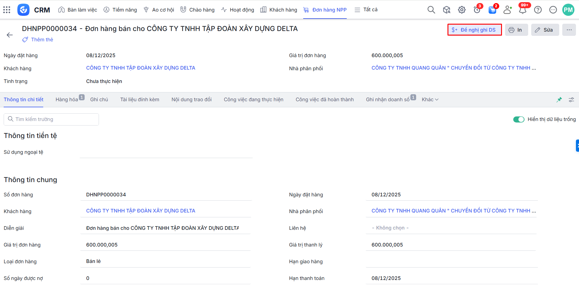 Bước 1: Ở chi tiết Đơn hàng NPP\Nhấn Đề nghị ghi DS (hoặc Ở màn hình danh sách Đơn hàng NPP\Tích chọn đơn hàng\Chọn Đề nghị ghi DS).