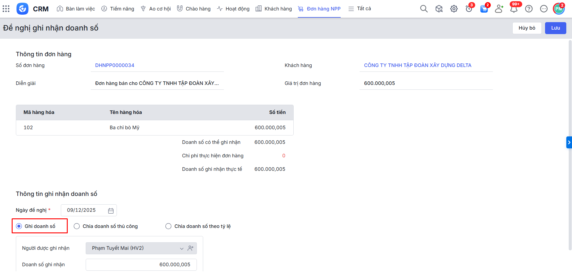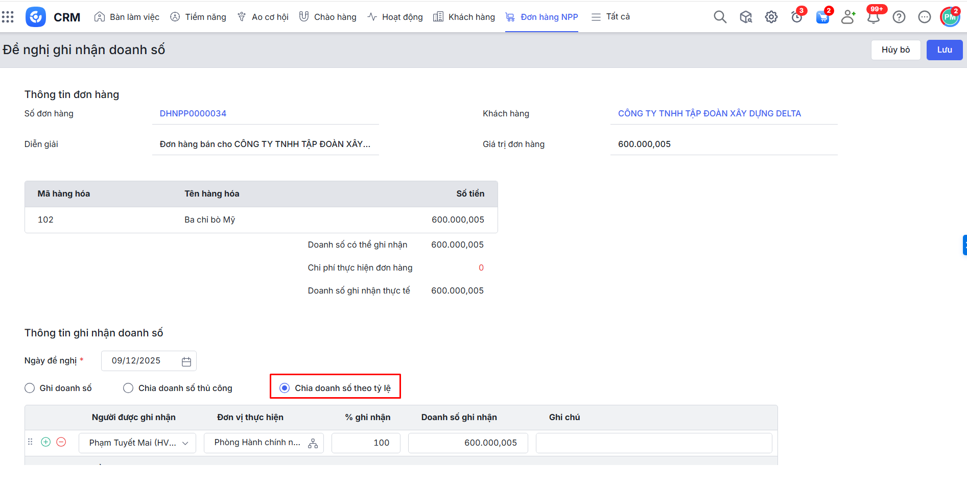 2.2.3. Đề nghị ghi doanh số Đơn hàng NPP (Chia doanh số theo tỷ lệ)