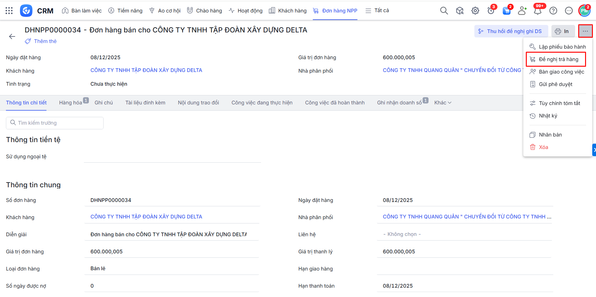 Bước 1: Tại giao diện danh sách Đơn hàng tại phân hệ Đơn hàng NPP\Nhấn đúp chuột vào 1 đơn hàng\Ở chi tiết Đơn hàng NPP nhấn biểu tượng dấu ba chấm \Chọn Đề nghị trả hàng.