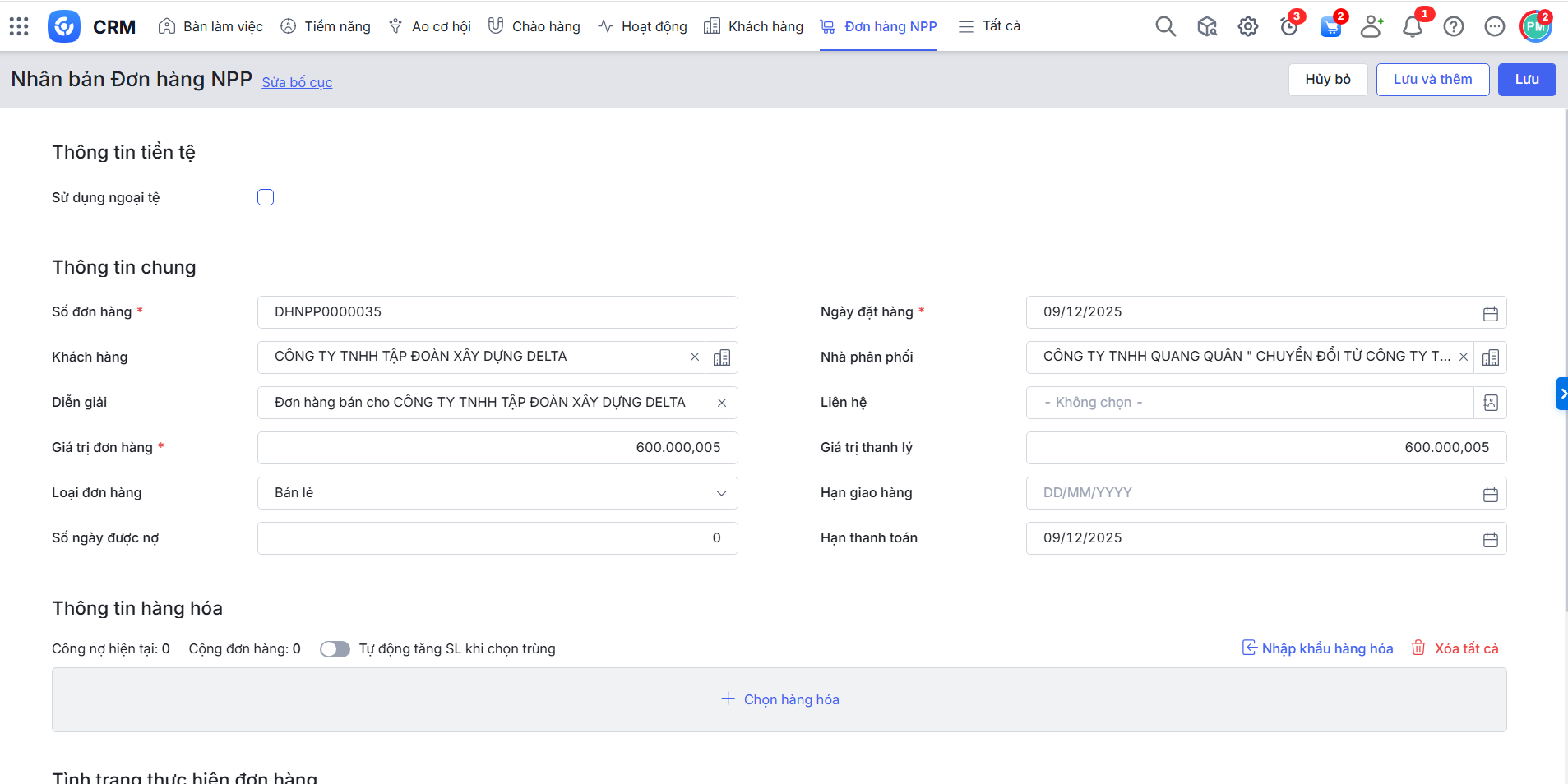 • Nhân bản: Nhân bản Đơn hàng NPP hiện tại thành 1 đơn hàng mới. Nhân bản\Sửa lại thông tin\Lưu.