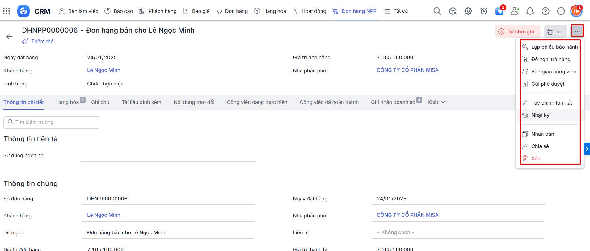 2.5. Các chức năng khác tại bản ghi chi tiết Đơn hàng NPP