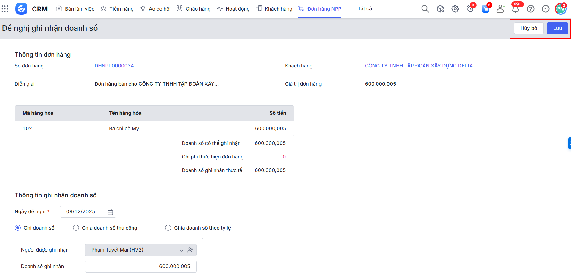 Bước 2: Phần mềm tự động hiển thị các thông tin DS ghi nhận, trong đó thông tin Người được ghi nhận doanh số được mặc định là Người thực hiện của Đơn hàng NPP.