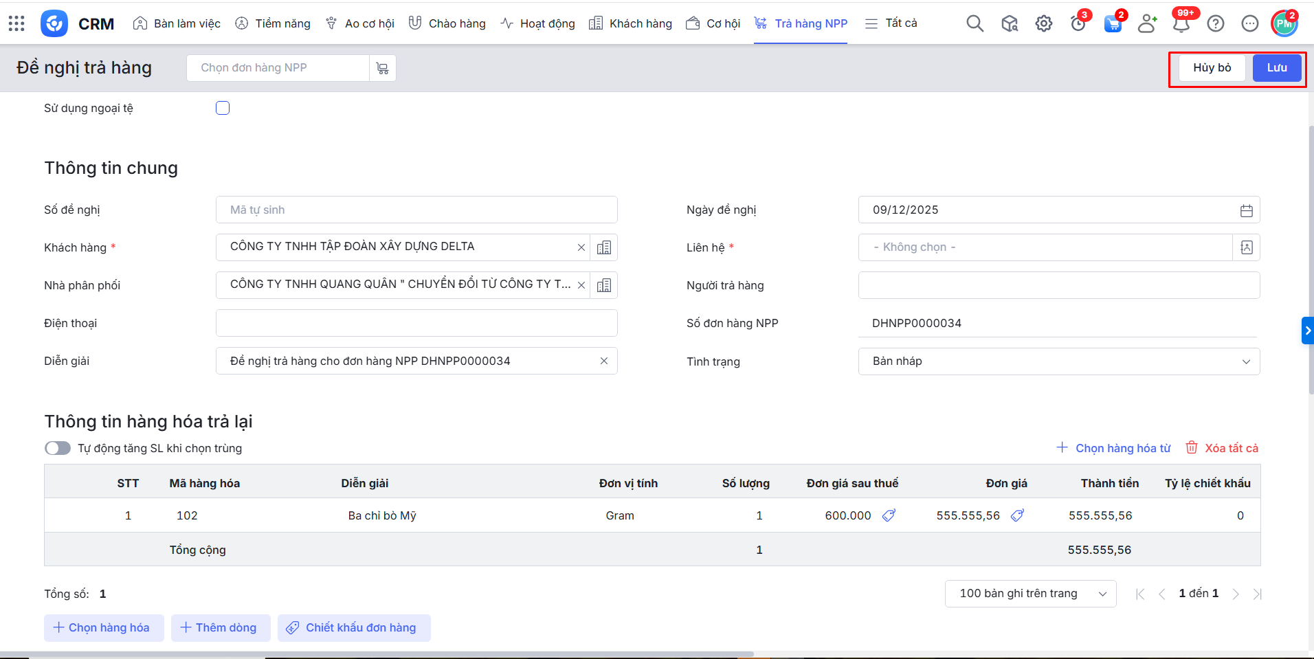 Lưu ý: Phần mềm chỉ cho phép trả lại hàng đối với Đơn hàng NPP có tình trạng ghi doanh số là Đề nghị ghi hoặc Đã ghi.