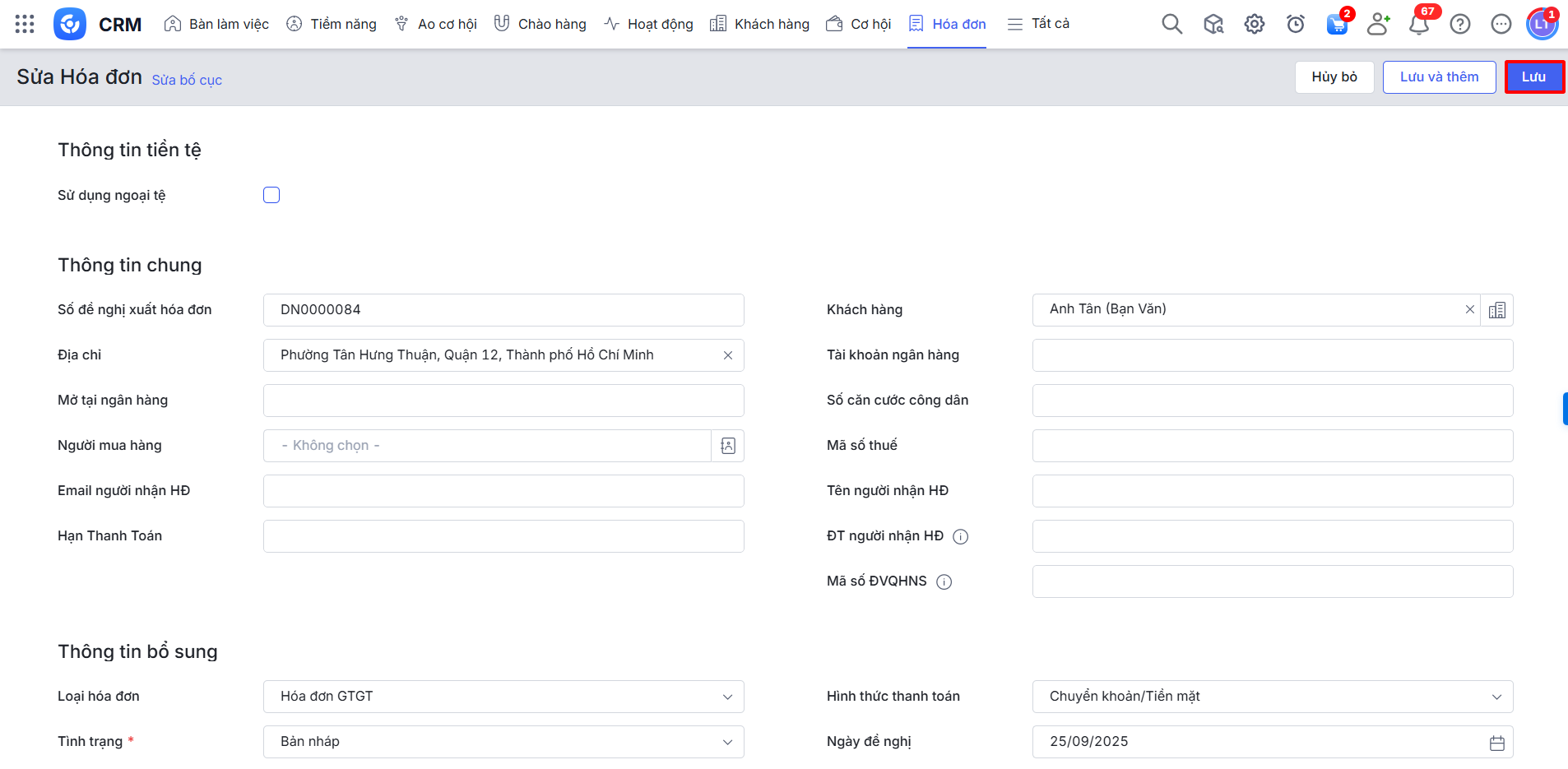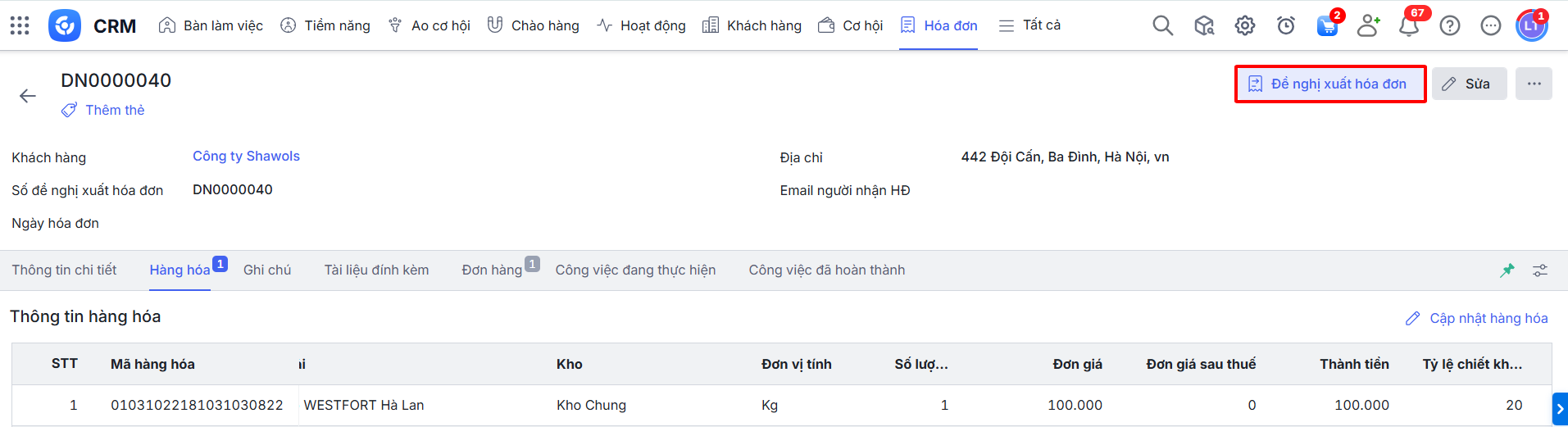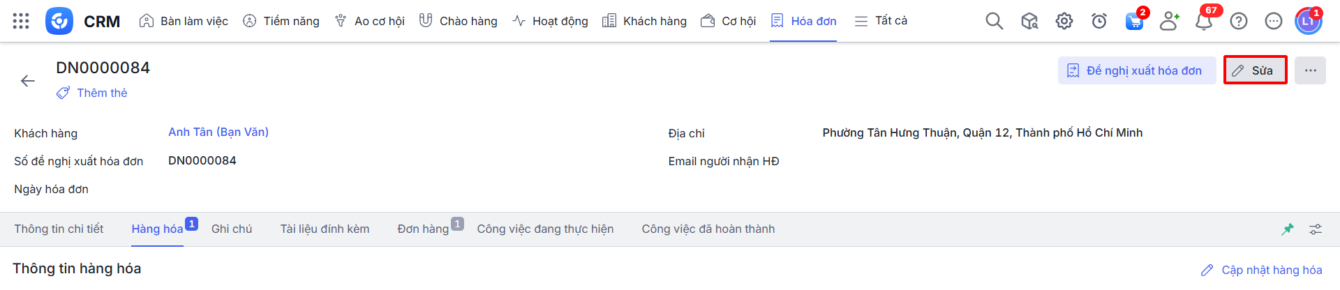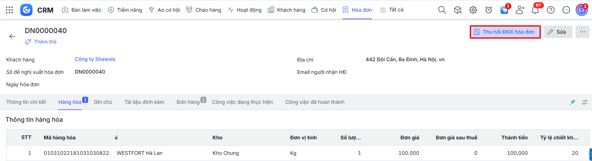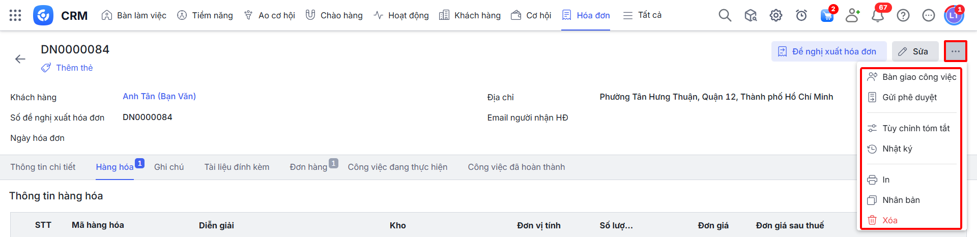 Bài viết hướng dẫn các chức năng trên giao diện Chi tiết bản ghi Hóa đơn, bao gồm: gửi đề nghị xuất hóa đơn, thu hồi đề nghị, sửa thông tin, các chức năng mở rộng và thao tác với danh sách liên quan.
