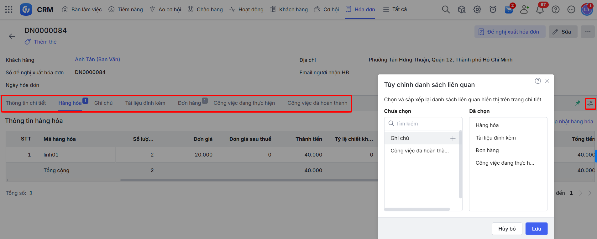 Bước 1: Tại chi tiết bản ghi Hóa đơn, vào mục Danh sách liên quan