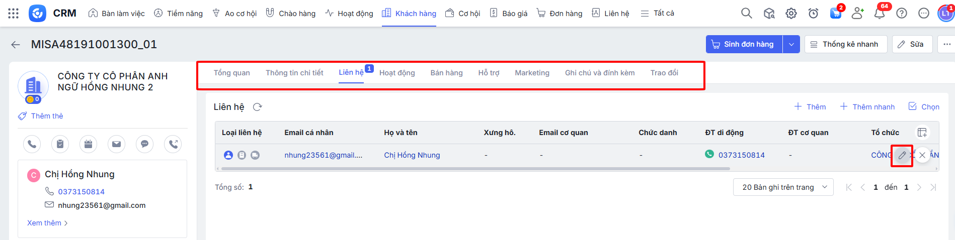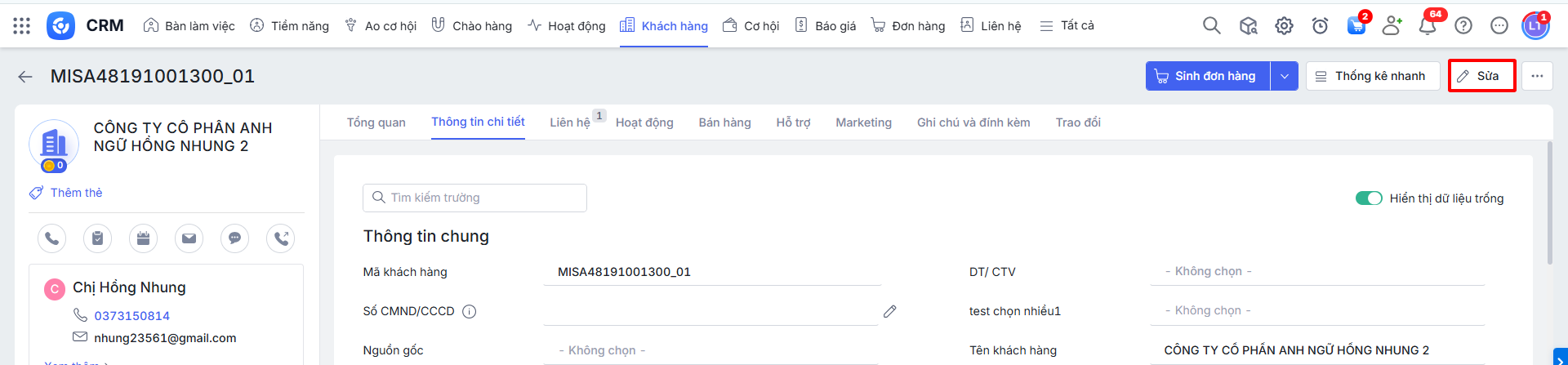 2.1. Sửa thông tin chi tiết bản ghi Khách hàngBước 1: Ở chi tiết bản ghi Khách hàng, nhấn Sửa.