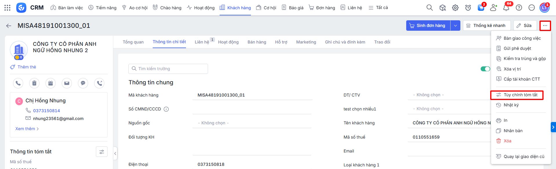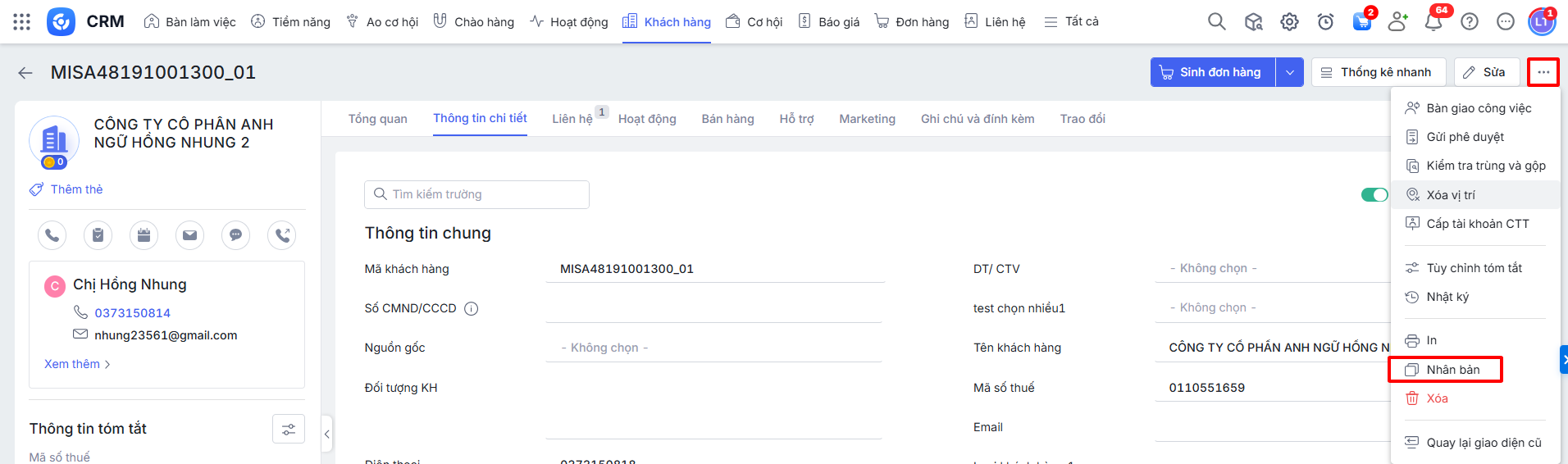 Hướng dẫn các thao tác cập nhật, chỉnh sửa, nhân bản, xóa và tùy chỉnh thông tin trong bản ghi Khách hàng.