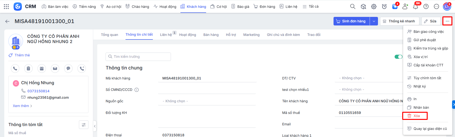2.6. XóaCho phép xóa bản ghi Khách hàng đang xem. Bước 1: Ở chi tiết bản ghi Khách hàng, nhấn biểu tượng ba dấu chấm (…) và chọn Xóa.