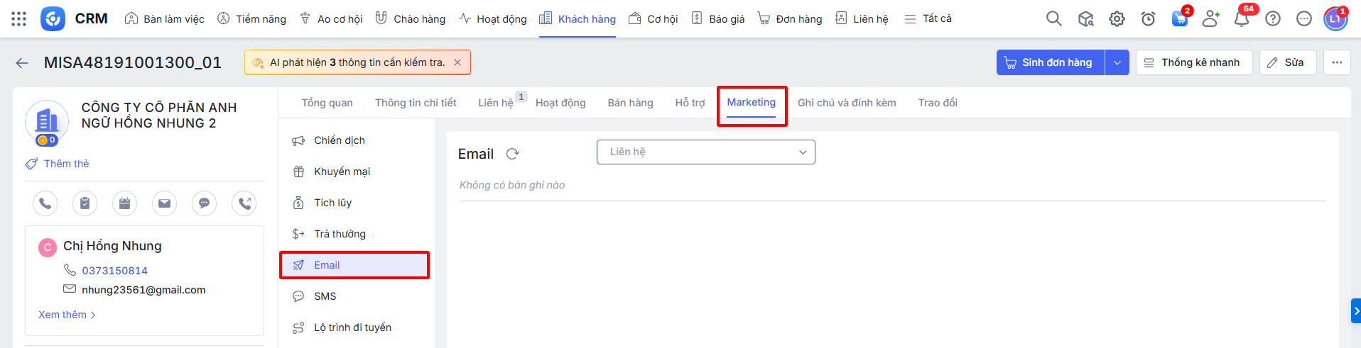 3.6. Tra cứu lịch sử gửi email cho khách hàngCho phép tra cứu lịch sử gửi email cho khách hàng từ tài khoản Gmail hoặc POP3/IMAP đã kết nối với AMIS CRM. Bước 1: Tại Danh sách liên quan \ vào mục Marketing \ vào mục Email.