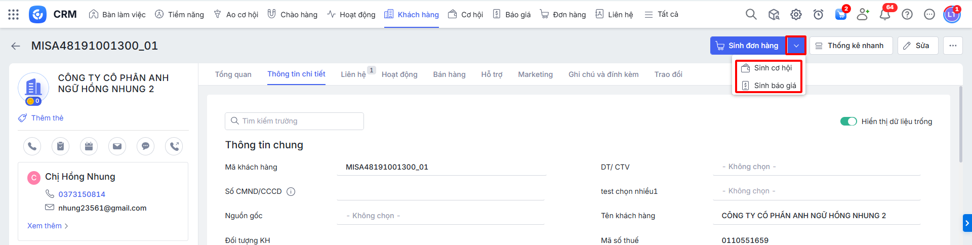 4.1. Sinh Đơn hàng, Cơ hội, Báo giá từ Khách hàngBước 1: Ở chi tiết bản ghi Khách hàng, nhấn Sinh đơn hàng/ Sinh cơ hội/Sinh báo giá tương ứng.